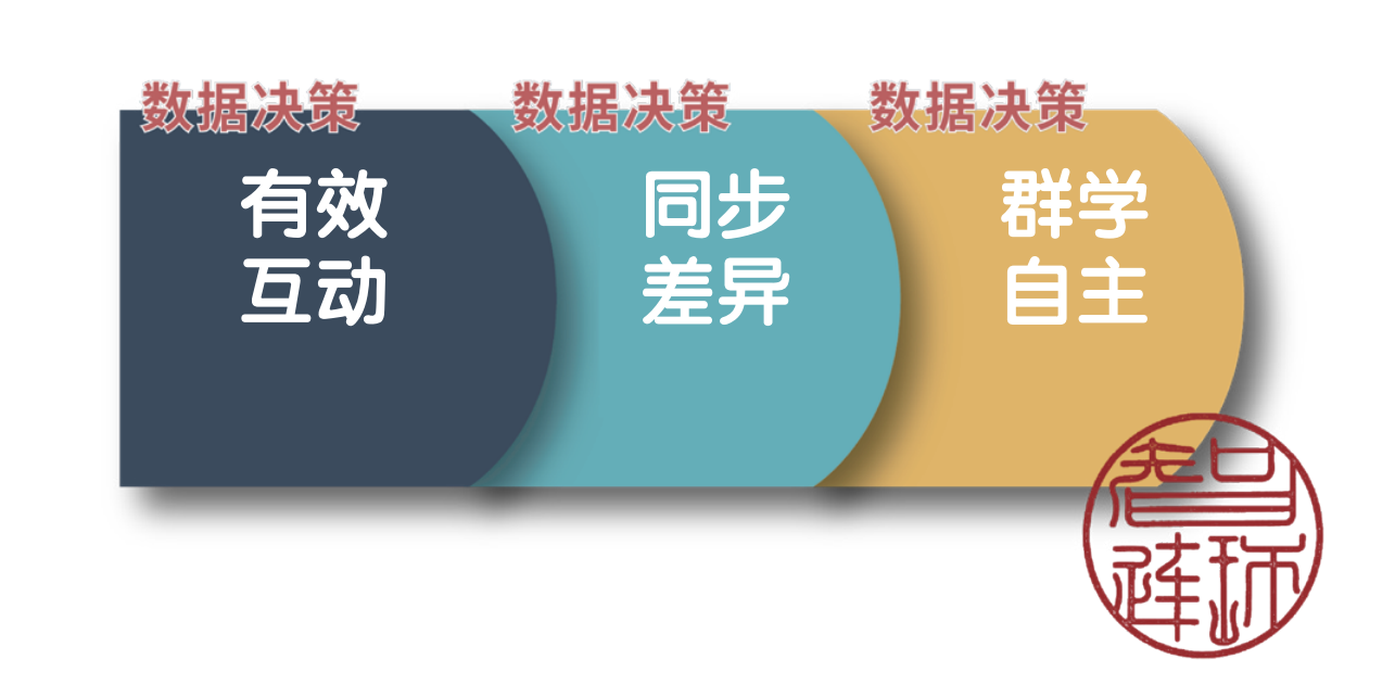 智連環(huán)學(xué)習法課堂,是運用數(shù)據(jù)智慧決策的現(xiàn)代課堂,包括有效交互、同步差異、群學(xué)自主等三個主要環(huán)節(jié),簡述如下: