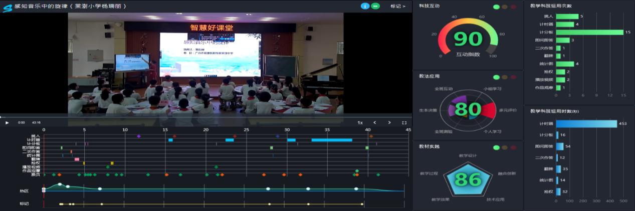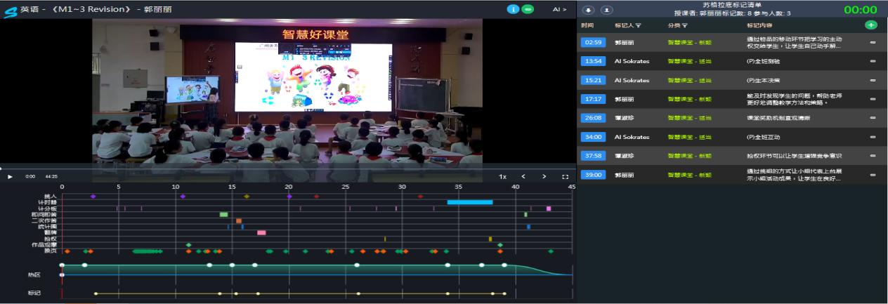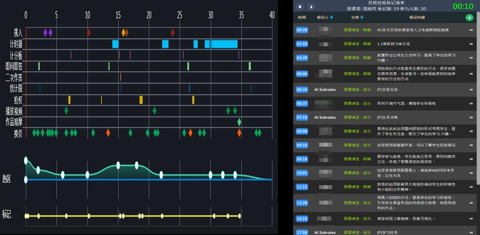 “AI 人工智能蘇格拉底”系統(tǒng)上除了有數(shù)字?jǐn)?shù)據(jù),還有時間切點數(shù)據(jù)和評課議課標(biāo)記數(shù)據(jù)(如圖 13 所示)。