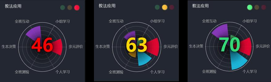 日常開展教研及主題研討時,本團(tuán)隊主要利用第二個教法應(yīng)用表進(jìn)行分析,通過對表上數(shù)據(jù)進(jìn)行深入的研究與分析,幫助上課教師解讀數(shù)據(jù)并提出建設(shè)性改進(jìn)意見,同時通過再次磨課查看研討成效。此表包含全班互動、生本決策、全班測驗、個人學(xué)習(xí)、多元評價和小組學(xué)習(xí)六個維度??砂蚜鶄€維度看成一個正六邊形的六個角,單個維度分?jǐn)?shù)值越高說明該教師相對應(yīng)的教學(xué)能力越強(qiáng),而各維度分?jǐn)?shù)值越接近說明該教師教學(xué)能力水平越平均。每個維度的分?jǐn)?shù)越高則得到的教法應(yīng)用的分?jǐn)?shù)就越高。
