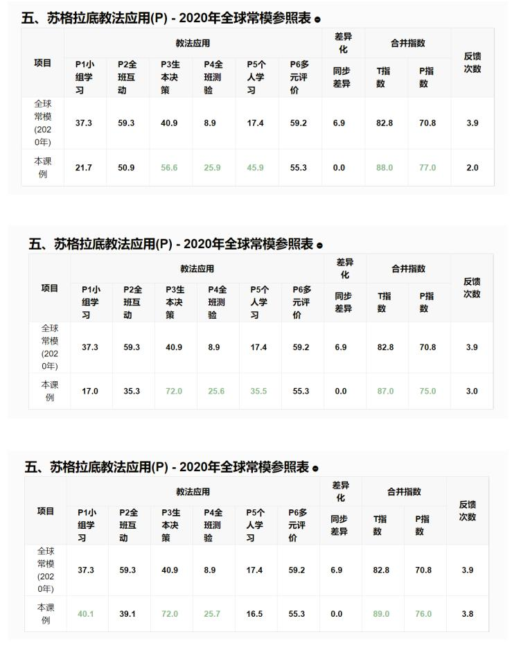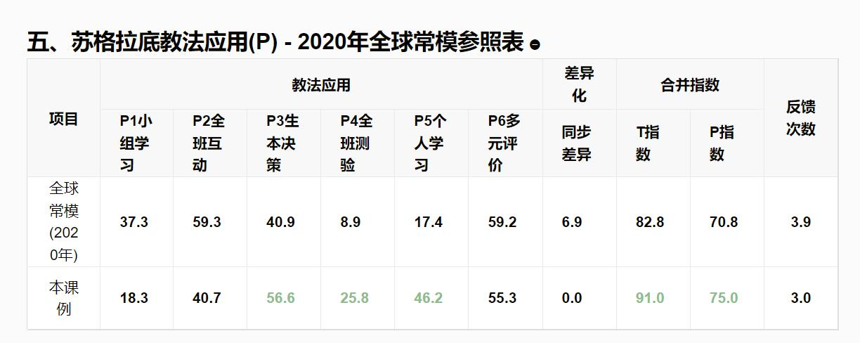 AI 數(shù)據(jù)表中自身教學(xué)的薄弱環(huán)節(jié)自主地選擇收看課例片段回看,同時還可結(jié)合“AI智慧教研”的評課議課標(biāo)記進(jìn)行切點式分析,及時診斷問題解決問題,進(jìn)一步提升教師的專業(yè)能力。但是,AI 數(shù)據(jù)表有時也不能準(zhǔn)確反映課堂教學(xué)問題。如前后兩或三次上課數(shù)據(jù)差距不大時,單純查看數(shù)據(jù)表不能精準(zhǔn)找出數(shù)據(jù)的差異性,這時就需要查看“蘇格拉底數(shù)位觀議課記錄表”中的“蘇格拉底教法應(yīng)用(P) - 2020 年全球常模參照表”(如圖 14 所示),對比各個維度的分值來查找細(xì)微的差距和原因。
