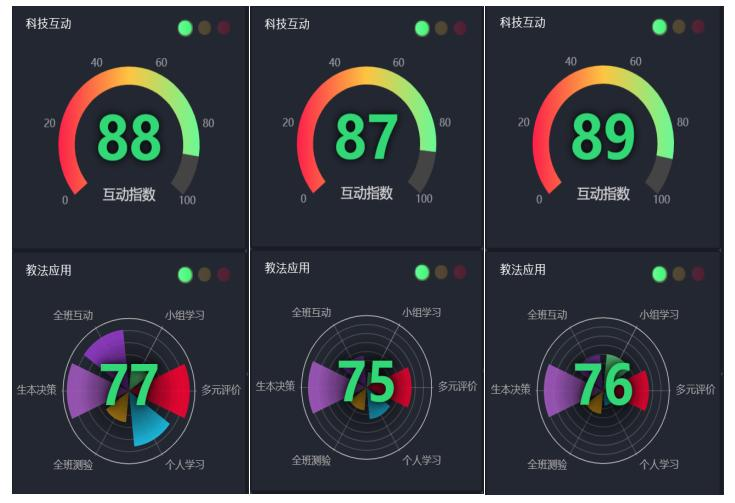 AI 課堂評價的報告中所顯示的紅、黃、綠三種顏色區(qū)分的等級分?jǐn)?shù)(如圖 1 所示),直觀了解自己所授課例在“科技互動”、“教法運用”兩個方面的得分??平M在開展校本教研時,還可根據(jù)系統(tǒng)生成的課堂教學(xué)行為大數(shù)據(jù)對該節(jié)課的課堂教學(xué)效果進(jìn)行整體評估及分析。