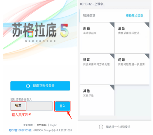 圖1 蘇格拉底平臺手機端登錄界面 教研平臺除了實時采集議課教師的標記,還能同步記錄課堂技術(shù)運用類型、技術(shù)運用時長等數(shù)據(jù),具體的教師行為,對應(yīng)著有各種各樣的技術(shù)應(yīng)用,什么時候使用了什么技術(shù),都標記的非常清楚,為其他聽課老師在學習技術(shù)使用時提供了便捷的操作,快速定位學習這項技術(shù)可以在課堂的什么環(huán)節(jié)進行運用,為技術(shù)的使用復刻提供有效方法。經(jīng)過學習、實踐、反思、調(diào)整到再實踐的過程有效掌握技術(shù)運用,有效學習教法運用,這也是學校培養(yǎng)青年教師的寶貴資源,解決了教師學習時間和空間難統(tǒng)一的問題,利用線上資源自定步調(diào)開展學習,為教師專業(yè)成長提供多元路徑。