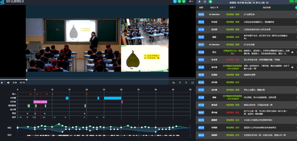 醍摩豆AI智慧教研中心(智慧型議課廳),是自動化采收與分析AI教育大數(shù)據(jù)的研究型教室,是結(jié)合專家智慧和機器智慧的教師專業(yè)發(fā)展練功房,同步采收專家智慧(觀課專家用觀議課APP標記的多媒體數(shù)據(jù))和機器智能(AI技術(shù)分析智慧教室教學所應(yīng)用到的功能),自動生成蘇格拉底影片和專家議課報表,在影片中自動紀錄課堂互動與觀課者意見,點選智慧標記可以迅速切換影片對應(yīng)時間點,所見即所得,這種應(yīng)用模式即可升級傳統(tǒng)公開觀議課,成為數(shù)位觀議課,協(xié)助觀課、議課活動更省力、更直覺、更科學、更高效!