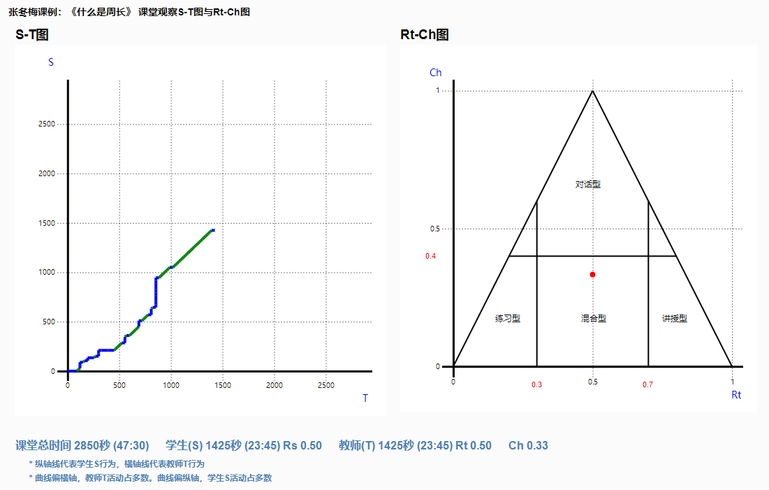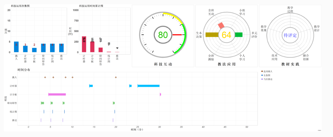圖五 S-T圖和RT-CH圖表 通過此份報告,教師很容易直觀看到本節(jié)課師生分配時間均衡,整體以學生為主居多,體現(xiàn)了教師學為中心的理念,符合當下雙新課堂的基本要求。其次本節(jié)課技術(shù)運用較多,多以計分板、即問即答、計時器等運用為主,但是技術(shù)與課堂的融合度還改進,學生小組學習、個人學習、全班測驗三個維度得分為零,直觀的數(shù)據(jù)如同有個專家隨時跟在身邊給予實時指導一樣,教師結(jié)合數(shù)據(jù)并分析數(shù)據(jù)可以再次在課堂上實踐與反思,嘗試后再次得出報告分析數(shù)據(jù)變化,找到符合學科特點的最佳教學方式。這樣看數(shù)據(jù)、分析數(shù)據(jù)并根據(jù)數(shù)據(jù)做出調(diào)整的方式實現(xiàn)了教師自主改進,在實踐反思中促進課堂質(zhì)量的提升。