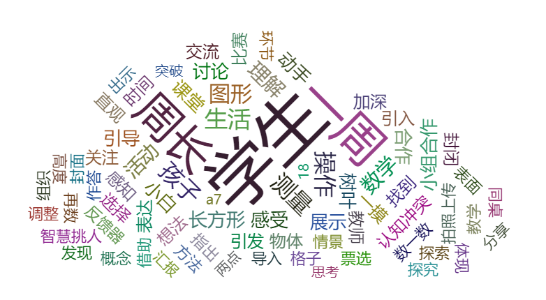 圖二 小學數(shù)學三年級上冊《什么是周長》教研平臺截圖 2.智能分析,促進反思 每個使用本系統(tǒng)的老師上完課馬上得到分析報表,有課堂科技互動、教法應(yīng)用得分(如圖三所示),有觀課教師標記文字云(如圖四所示),有S-T圖和RT-CH圖表(如圖五所示)。 報告以容易理解的圖表將分析結(jié)果視覺化,方便教師閱讀,也方便研修時的數(shù)據(jù)提取。通過直觀的得分教師可以清楚看到自己的課堂的問題,為精準反思提供依據(jù)。