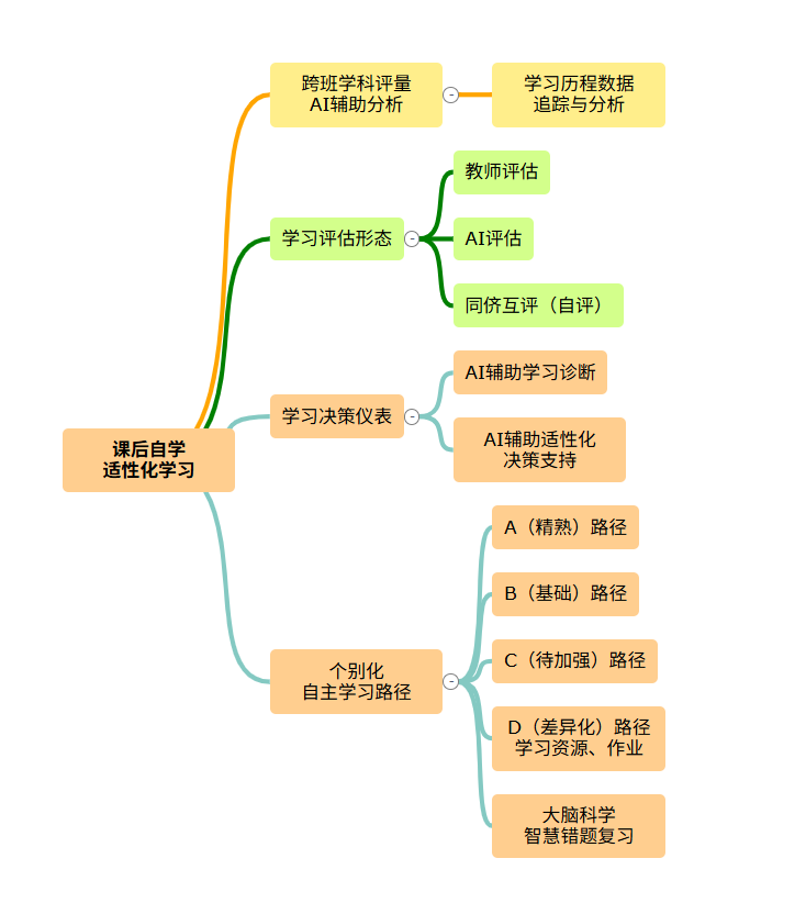 教師專業(yè)指導(dǎo)下的自學(xué)適性化學(xué)習(xí)路徑圖,是以課堂群學(xué)為軸的課后適性化自學(xué)路徑,課堂學(xué)習(xí)總目標(biāo)是共同軸線,而根據(jù)不同學(xué)生的需求、興趣和能力(經(jīng)驗(yàn))等不同學(xué)習(xí)動機(jī),設(shè)計(jì)難度不同、材料不同和份量不同的差異化學(xué)習(xí)路徑,或營造讓學(xué)生具有選擇權(quán)、充滿挑戰(zhàn)性和容易有成功感的適性化學(xué)習(xí)路徑。在群學(xué)課堂中每個(gè)學(xué)習(xí)節(jié)點(diǎn),可根據(jù)課堂生成的學(xué)習(xí)報(bào)告,提供差異化的學(xué)習(xí)資源、AI診斷分析與學(xué)習(xí)建議等,輔助學(xué)生適性自學(xué)。教師專業(yè)指導(dǎo)下的自學(xué)適性化學(xué)習(xí)路徑圖(HABOOK, 2025)