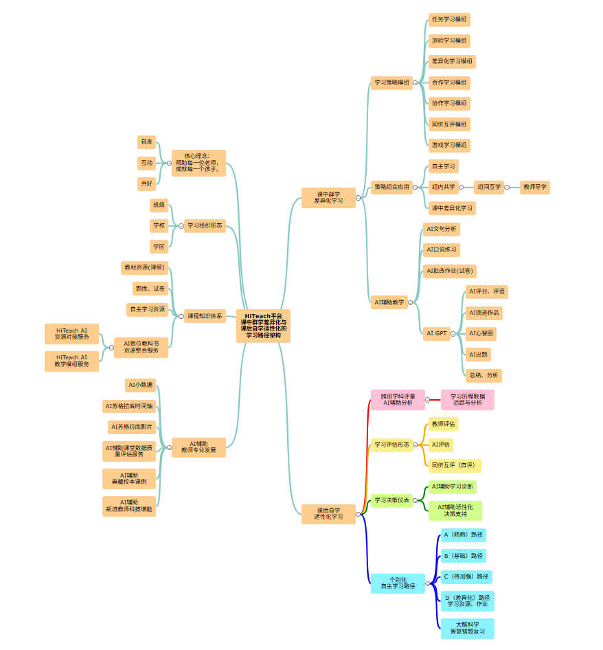 HiTeach平臺具有強(qiáng)大的課程體系支持系統(tǒng),并借助課中群學(xué)活動的完整學(xué)習(xí)歷程記錄,可充分支持教師實(shí)施課后適性與個(gè)別化學(xué)習(xí)路徑。例如:借助教師評估、AI評估與同儕互評等學(xué)習(xí)評估數(shù)據(jù),以及跨班學(xué)科評量后AI輔助分析的學(xué)習(xí)記錄數(shù)據(jù),教師使用學(xué)習(xí)數(shù)據(jù)決策儀表,可針對每一位學(xué)生進(jìn)行學(xué)習(xí)診斷與個(gè)別化學(xué)習(xí)路徑?jīng)Q策。包括精熟路徑、基礎(chǔ)路徑、待加強(qiáng)路徑、差異化路徑,以及精準(zhǔn)智慧錯(cuò)題練習(xí)等。 三、HiTeach平臺課中群學(xué)差異化和課后自學(xué)適性化的學(xué)習(xí)路徑架構(gòu)