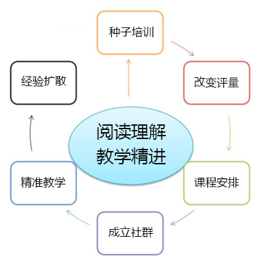 做為初衷,也做為終極目標。第一步先行遴選中年級種子教師進行‘種子培訓’,以‘改變評量’作為實施的策略,同時進行校內實施閱讀理解教學的‘課程安排’;再者,以‘成立社群’創(chuàng)建專業(yè)對話機制,并進行‘經驗擴散’,以漸進的方式逐步達成‘精進教學’的目標。