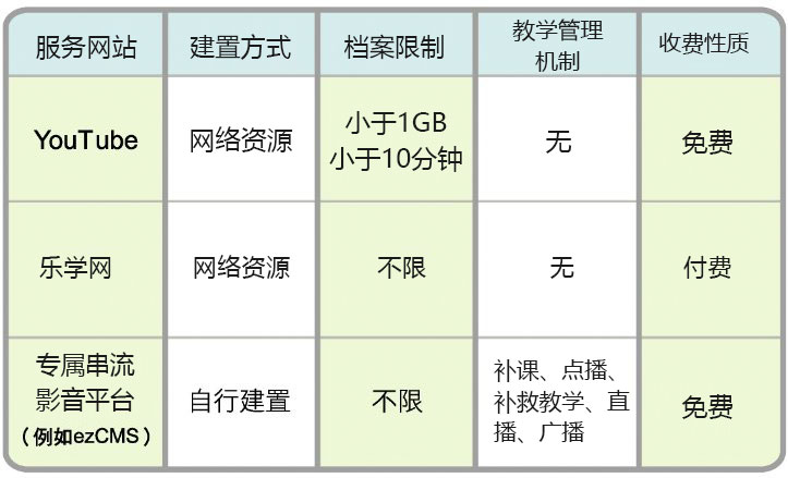 YouTube是大家熟知免費(fèi)的串流影音服務(wù)平臺,我們不但可以隨時(shí)從上面看到世界各地發(fā)送上來的影片,也可以把自己的影片發(fā)送到Y(jié)ouTube。不過,把這種服務(wù)平臺應(yīng)用到學(xué)校的教學(xué)中,還是有許多需要克服的問題,例如文件大小限制、時(shí)間限制、課程管理、知識產(chǎn)權(quán)、商業(yè)廣告等多重問題。 此外,也有補(bǔ)教業(yè)者建置的串流影音平臺,提供學(xué)生付費(fèi)上網(wǎng)觀看影音教材。前述兩類影音平臺,實(shí)際應(yīng)用到教學(xué)上,都存在一些問題,若經(jīng)費(fèi)許可,由學(xué)校自行創(chuàng)建具有教學(xué)管理機(jī)制(包含教材發(fā)送、課程管理、權(quán)限管理、帶寬管理等)的影音串流平臺,并結(jié)合自動化的 錄播系統(tǒng),可以發(fā)展出比較理想的e化教學(xué)環(huán)境。