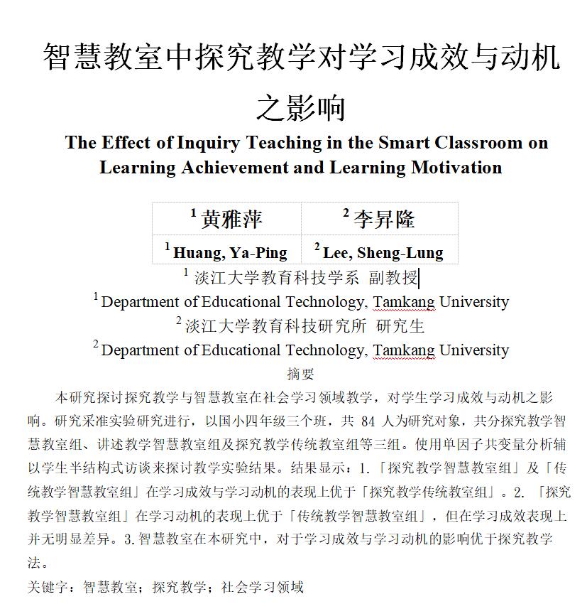 這篇論文是淡江大學(xué)黃雅萍教授和臺北市金華國小李昇隆老師的研究論文。金華國小這幾年也導(dǎo)入TEAM Model智慧教室,從這篇論文的結(jié)果發(fā)現(xiàn),成果是很好的!