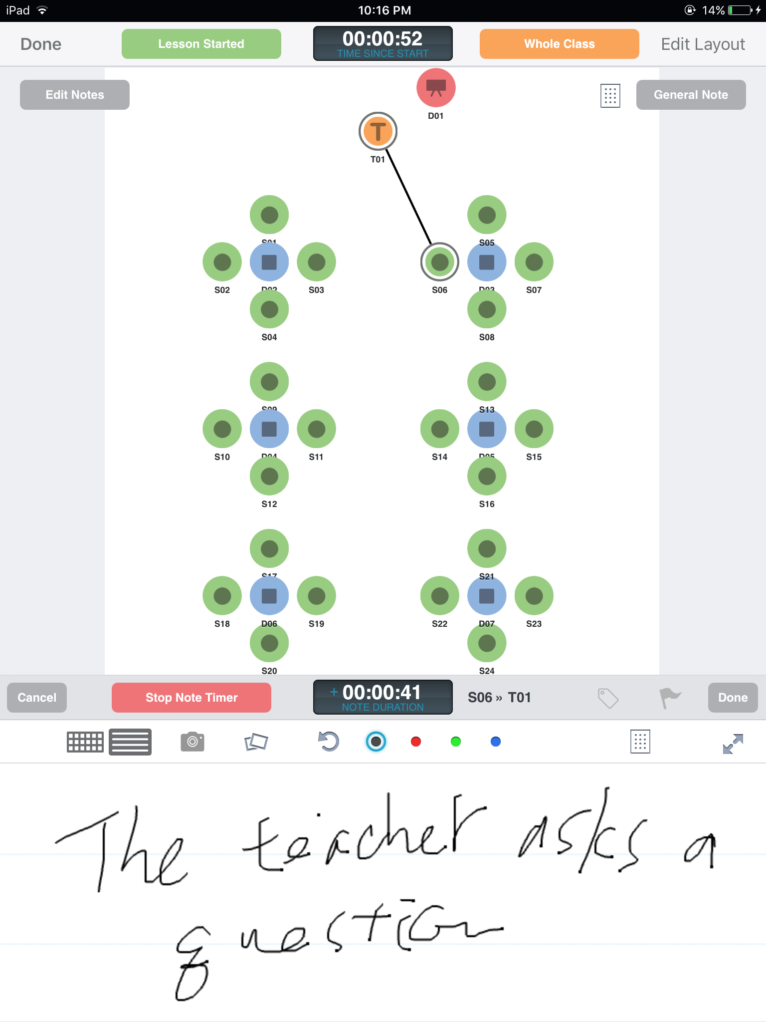 LessonNote (Version 3.8.1; Lesson Study Alliance, 2018)系統(tǒng)是一套透過(guò)iPad平板計(jì)算機(jī)進(jìn)行課堂紀(jì)錄的應(yīng)用程序。LessonNote保留座位表的特性,觀察者將在課堂上觀察到的行為透過(guò)畫(huà)記、筆記、錄音、照相等方式將師生互動(dòng)記錄下來(lái)(圖2)。這些紀(jì)錄都附有事件戳記方便課后排序追蹤。整體而言,LessonNote可視為座位表紀(jì)錄的進(jìn)化版本;LessonNote能記錄的模式較多元,也有時(shí)間戳記方便事后分析。傳統(tǒng)的座位表記錄也許可做到類似的效果,但需要?jiǎng)佑玫娜肆ο喈?dāng)可觀,而觀察員之間的同步協(xié)調(diào)也不容易達(dá)到。圖二: LessonNote操作界面