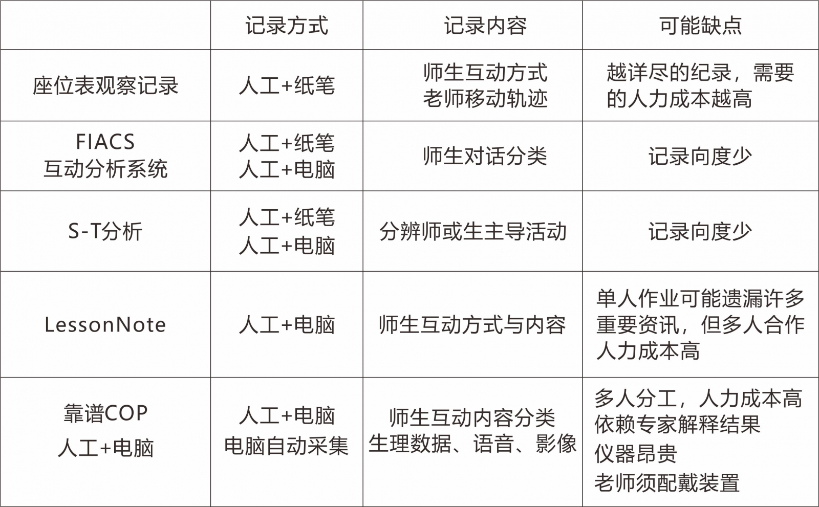 貳、相關(guān)研究 提升教學(xué)專業(yè)讓學(xué)生學(xué)得更好,是身為一位專業(yè)教師的終身職志。要如何提升老師的教學(xué)專業(yè)?教研活動(dòng)被認(rèn)為是一個(gè)能提升教師專業(yè)發(fā)展的有效方式(Lewis & Tsuchida, 1998)。為了有效地進(jìn)行教研活動(dòng),充分的資料與數(shù)據(jù)是必需的素材。因此持續(xù)有專家學(xué)者投入研究與發(fā)展老師課堂教學(xué)的觀察記錄與分析工具(如:Flanders, 1961; Gorham, 1988; Hughes, 1962; Liang, Huang, & Tsai, 2012; Pennings, Brekelmans, Wubbels, van der Want, Claessens, & van Tartwijk, 2014 ; Schempp, McCullick, Pierre, Woorons, You, & Clark, 2004)。我們也可以看到分析工具的演變,從傳統(tǒng)的紙筆紀(jì)錄,如:座位表觀察記錄SCORE(Gall & Acheson, 1980)、FIACS互動(dòng)分析系統(tǒng)(Flanders, 1966)、S-T分析(藤田、吉本,1980)等,到近代借助計(jì)算機(jī)進(jìn)行紀(jì)錄的LessonNote (Version 3.8.1; Lesson Study Alliance, 2018)、援用大數(shù)據(jù)分析的靠譜COP(王陸、蔡榮嘯,2016)、使用穿戴式感應(yīng)器記錄教學(xué)行為的教學(xué)分析(Prieto, Sharma, Dillenbourg, & Jesús, 2016)……等。這些方法各有其特色,以下擷取上述幾項(xiàng)工具進(jìn)行討論與分析。