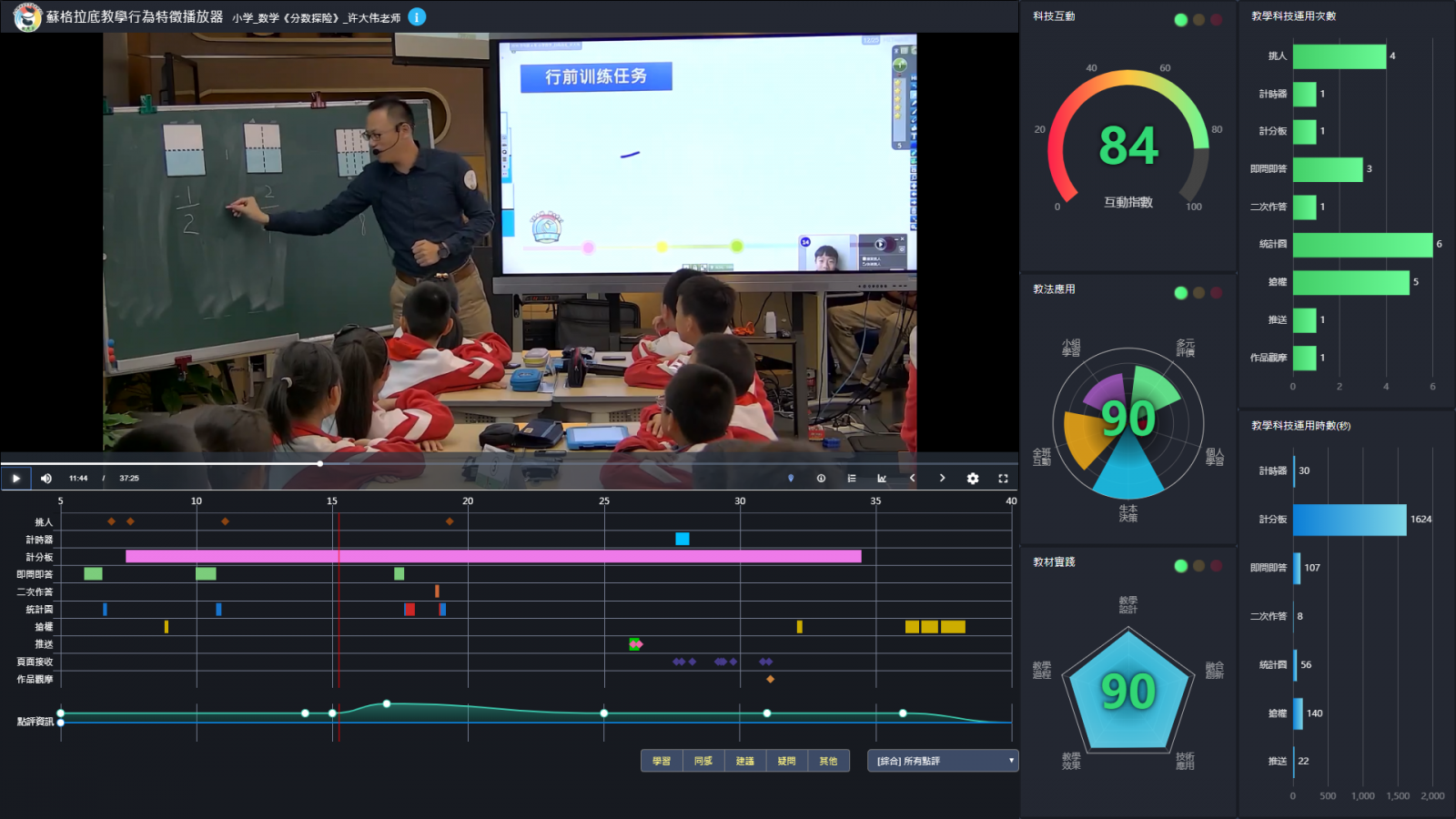3.2 蘇格拉底影片 過(guò)去的研究指出,若是多了上課錄像的輔助,老師的反思內(nèi)容將明顯與單純依靠記憶進(jìn)行反思不同,原本只靠回想進(jìn)行反思的重點(diǎn)都集中在教室管理以及自己的表現(xiàn),有了影片輔助后,老師的反思重點(diǎn)將轉(zhuǎn)移到授課內(nèi)容與學(xué)生的表現(xiàn)(Rosaen, Lundeberg, Cooper, Fritzen, & Terpstra, 2008)。為了進(jìn)一步提升教研的效率,基于靜態(tài)蘇格拉底教學(xué)行為分析報(bào)告的基礎(chǔ),我們開(kāi)發(fā)了結(jié)合上課實(shí)錄、智慧標(biāo)簽、與智能分析圖表的「蘇格拉底影片」,一方面讓教研的過(guò)程能更清楚看到教學(xué)現(xiàn)場(chǎng)實(shí)際發(fā)生的狀況,另一方面也讓擔(dān)任該堂課教學(xué)的老師對(duì)自己的教學(xué)實(shí)踐有更深入的體會(huì)與反思。