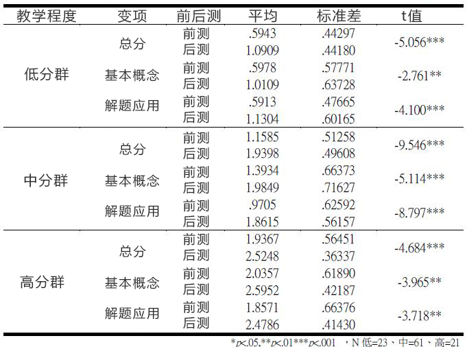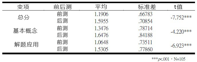 由表1與表2可發(fā)現(xiàn),全體學(xué)生在分?jǐn)?shù)(1)之各變項(xiàng)前后測(cè)均達(dá)顯著差異;分高中低分群學(xué)生來(lái)看,前后測(cè)亦達(dá)顯著差異,顯示應(yīng)用「激發(fā)討論教學(xué)模式」進(jìn)行數(shù)學(xué)討論教學(xué),能有效提升五年級(jí)學(xué)生在分?jǐn)?shù)乘法單元學(xué)習(xí)成效。