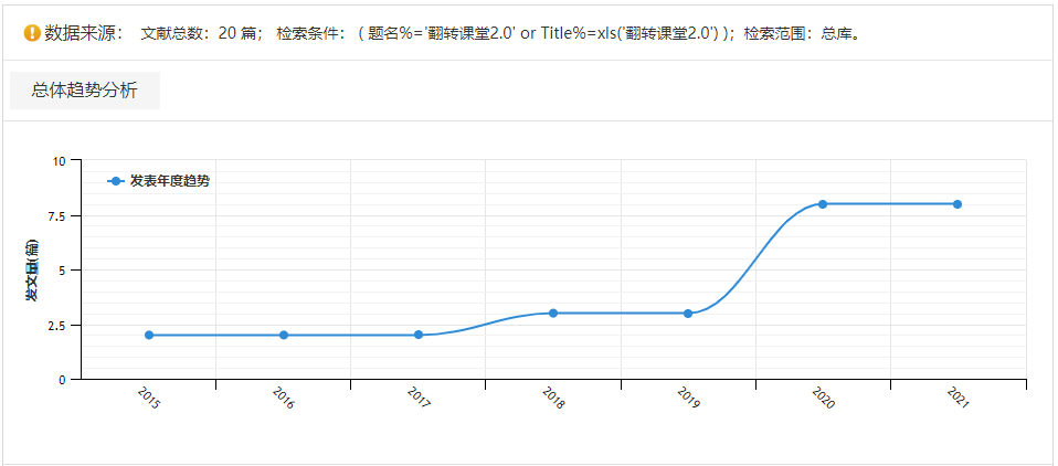中國知網(wǎng)2015-2020年“翻轉(zhuǎn)課堂2.0”的文獻(xiàn)總數(shù)計(jì)20篇,年度分布如下圖所示。其中有7篇是關(guān)于大學(xué)SPOC課程的翻轉(zhuǎn)課堂,8篇是高(職)教專業(yè)課程翻轉(zhuǎn)課堂,與中小學(xué)密切相關(guān)的論文只有5篇。