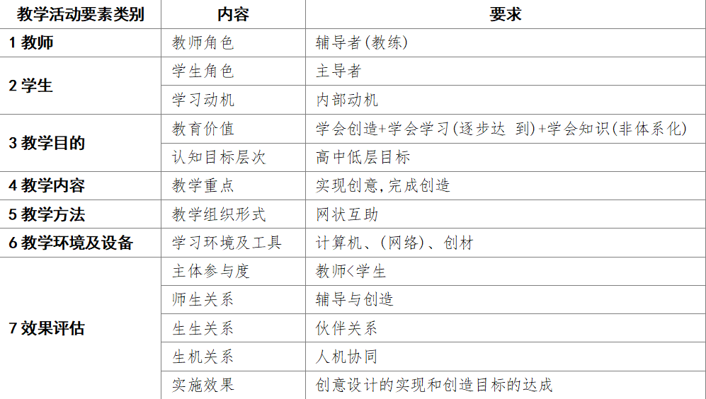 上表中的七個(gè)要素,從目標(biāo)到內(nèi)容、方法,再到效果,都聚焦于“創(chuàng)造”,與翻轉(zhuǎn)課堂2.0“為創(chuàng)造而學(xué),為創(chuàng)造而教”的理念相呼應(yīng)。