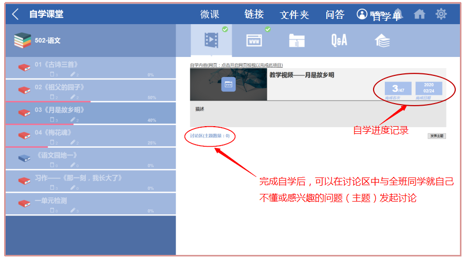 自學(xué)課堂是一種在線的前置性學(xué)習(xí),學(xué)生通過自學(xué)完成知識(shí)的第一次內(nèi)化。