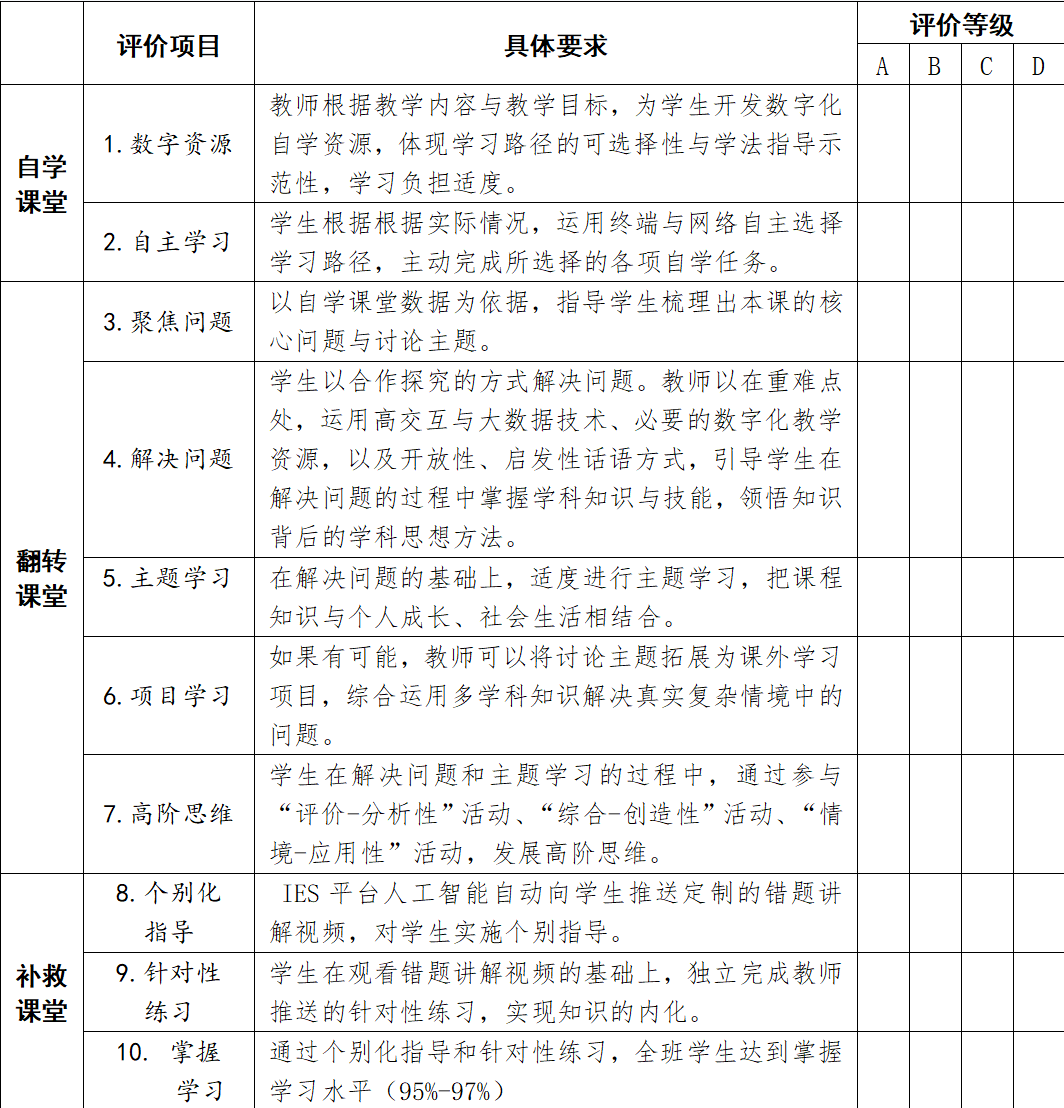 補(bǔ)救課堂是學(xué)困生掌握知識(shí)的“補(bǔ)給站”。布魯姆的掌握學(xué)習(xí)理論認(rèn)為,只要給予足夠的時(shí)間和適當(dāng)?shù)慕虒W(xué),幾乎所有的學(xué)生對(duì)幾乎所有的學(xué)習(xí)內(nèi)容都可以達(dá)到掌握的程度。因而,一些對(duì)新知識(shí)掌握有困難的學(xué)生,需要更多的學(xué)習(xí)時(shí)行和更適切的教師指導(dǎo)。因而,補(bǔ)救課堂就成了學(xué)習(xí)困難學(xué)生的“補(bǔ)給站”,他們可以通過回看教師錯(cuò)題講解視頻,并完成針對(duì)性的練習(xí)內(nèi)化所學(xué)知識(shí),達(dá)到“掌握學(xué)習(xí)”的水平。同時(shí),教師也可以利用補(bǔ)救課堂給學(xué)優(yōu)生適量推送綜合練習(xí),提高他們的解決問題的能力。 ㈥評(píng)價(jià)標(biāo)準(zhǔn)