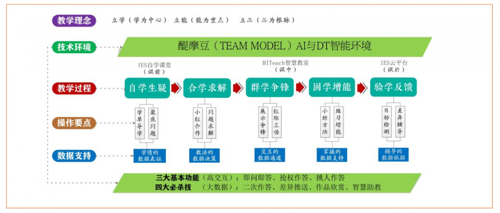 當前教育正處于核心素養(yǎng)與信息化2.0交匯的“新時代”,課堂變革的環(huán)境條件遭遇百年未遇之變局,亟須方法論的重構引領方法的創(chuàng)新,方可走出當前課改的低迷狀態(tài)。成都市溫江區(qū)鵬程小學校在全面總結近20年以來新課改經(jīng)驗的基礎上,提出以“三立”課堂建設為抓手,以課堂形態(tài)變革促進教學轉型的課改思路,在實踐中不斷豐富其內涵,并進行課改方法的持續(xù)創(chuàng)新,將其形成“新時代”課改方法論,以此引領學校課改沿著正確的方向推進。 一、研究的背景與問題提出 ⒈研究的背景 《教育信息化2.0行動計劃》的頒布,標志著課堂教學改革進入“大數(shù)據(jù)時代”。隨著人工智能、云計算與大數(shù)據(jù)技術涌入課堂,課堂教學面臨著時序的重置與空間的變化,并由此帶來包含時空結構、教學結構、學習方式、師生關系等在內的課堂形態(tài)變革與教學轉型。其中,一個最為顯著的變化是教學過程伴隨著數(shù)據(jù)與資源的流動。大數(shù)據(jù)驅動的教學,并由此生成的多種課堂形態(tài),成為大數(shù)據(jù)時代課堂變革的技術環(huán)境與改革的基本走向。 ⒉問題的提出 成都市溫江區(qū)鵬程小學在智慧校園建設中引進了醍摩豆(TEAM MODEL)教育科技,提出了“三立”課堂立學、立能、立品的改革愿景。智能的教學技術環(huán)境,學習素養(yǎng)取向的教學改革目標,決定著學校的課改必須實現(xiàn)方法論的創(chuàng)新:其一,在微觀層面,如何做到技術(T)、教學方法(P)與學科教學內容(C)深度融合,即TPC三位一體,用技術帶動教學內容、教學方式與課堂形態(tài)變革?其二,在中觀層面,如何做到課堂變革與班級建設同步推進,實現(xiàn)班課同構形成改革合力,用學習組織變革推動學習方式與課堂形態(tài)變革?其三,在宏觀層面,如何做到課堂變革與學校文化生態(tài)雙向建構,為課堂變革提供制度保障與精神給養(yǎng),用學校文化變革推動? 二、變革策略 ㈠課堂建模:促進課堂形態(tài)變革 課改改課,通過課堂建模與教學核心目標的重構,促進教學要素的重新組合,進而促進課堂形態(tài)變革。 ⒈建構“三立”課堂教學模式 學校引進醍摩豆教育科技,實現(xiàn)智慧教室全覆蓋,建構了基于人工智能與大數(shù)據(jù)技術環(huán)境的“三立”課堂教學模式(如下圖所示),體現(xiàn)了一種全新的教學形態(tài),具有以下三個方面的特征。