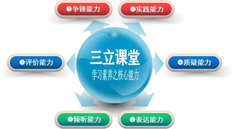 ⒉培養(yǎng)學習核心能力 學習核心能力是“中國學生發(fā)展核心素養(yǎng)”之小學生“學會學習素養(yǎng)”的核心構成,是學生終身學習與發(fā)展必備的基本技能。鵬程小學校根據(jù)學生實際,提出了六大學習核心能力模型,如下圖所示。 ⑴“學以致知”基礎性的學習能力:傾聽能力、表達能力 傾聽能力是學生將教師與同學表達的信息在頭腦中轉換成意義的能力,它由傾聽過程中的對表達內容的注意力與辯析構成,可以通過“聽-說”、“聽-思”、“聽-記”、“聽-評”的方式進行訓練。 表達能力是指學生用語言,輔之以圖表、動作把自己的觀點、情感表現(xiàn)出來,讓聽者理解的能力,由表達觀點與表達方式構成。教學過程中要訓練學生表達的準確性、簡潔性、生動性、多樣性與創(chuàng)造性。 ⑵“學以致思”的高階學習能力:評價能力、質疑能力 評價能力是指學生按照一定的標準對他人的學習狀態(tài)與學習結果進行分析評判的能力,由對評價對象的理解與評價技能構成。教學中可以訓練學生根據(jù)一定的評價標準對評價對象進行評價,評價的本方法有“對標評價法”、“錯誤分析法”、“優(yōu)點欣賞法”、“創(chuàng)意點評法”。 質疑能力是指學生在教學過程中對文本或他們的觀點產生疑難或懷疑而提出問題的能力,由質疑意識與質疑技能構成。教學過程中,教師要培養(yǎng)學生質疑的意識,掌握“疑點”的規(guī)律,并教授學生質疑的方法:比較質疑、類比質疑、推理質疑、反例質疑、批判質疑。 ⑶“學以致用”實踐能力:爭鋒能力與實踐能力 爭鋒能力指個人或小組在學習競賽性學習中挑戰(zhàn)致勝的能力,由競爭意識與致勝技能構成。教學中要設計競賽性學習活動,教授學生求異、創(chuàng)新、超越等挑戰(zhàn)致勝技能。 實踐能力是學生動手操作發(fā)現(xiàn)知識的能力和運用知識解決問題的能力,由動手操作與分析、綜合等高階思維技能構成。教學中要創(chuàng)設問題情境,引導學生操作發(fā)現(xiàn)與解決問題,發(fā)展學生的實踐能力。 ㈡聚合力量,推動教學轉型 ⒈班改:為教學提供精神給養(yǎng) 班改改班。班級與小組是學習組織,是學生學習與生活的共同體。其中, 班級的價值觀念、規(guī)章制度、物質環(huán)境構成學生學習與生活的文化生態(tài),為學生的學習提供“精神給養(yǎng)”;學習小組是學習活動的基本組織,學生通過對小組學習活動的參與,實現(xiàn)知識建構和“角色認同”。 ⑴班級環(huán)境文化建設班級標牌。班級標牌是班級的顯著標志,也是班級對外宣傳的窗口,是班級文化的表征。每個班都制作電子班牌,呈現(xiàn)班級風采、班主任簡介、班級愿景,動態(tài)呈現(xiàn)小組簡介。動態(tài)呈現(xiàn)的內容可以即時進行更新,對小組具有激勵作用。