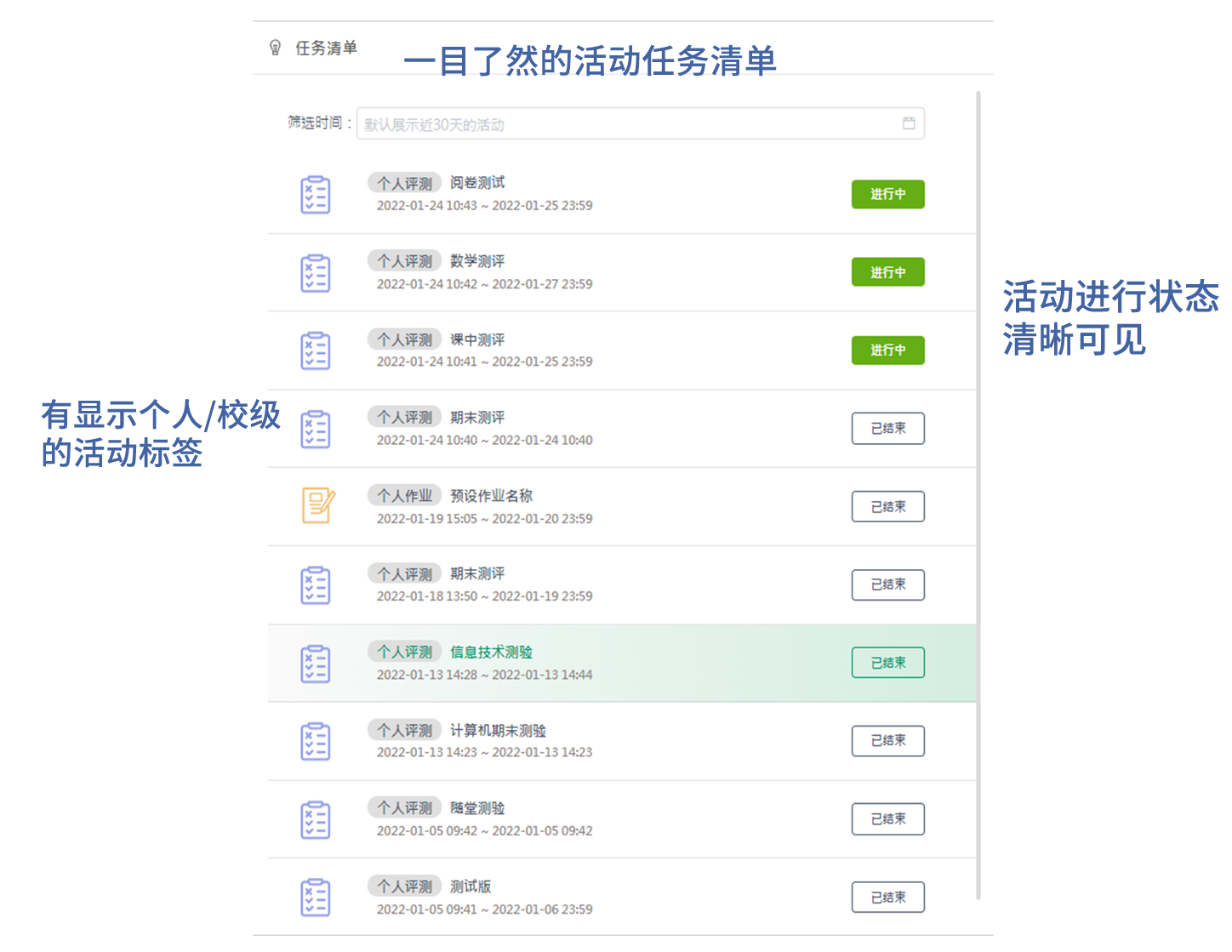 云平臺(tái)IES是學(xué)習(xí)評(píng)量管理平臺(tái),也是學(xué)習(xí)評(píng)量數(shù)據(jù)匯流平臺(tái)。學(xué)校教師在云平臺(tái)布置學(xué)習(xí)評(píng)量作業(yè)、學(xué)習(xí)評(píng)量任務(wù)以及學(xué)習(xí)評(píng)量測(cè)驗(yàn)活動(dòng)后,會(huì)自動(dòng)通知學(xué)生端AClass ONE。學(xué)校教師在云平臺(tái)IES也可以隨時(shí)管理掌握學(xué)習(xí)評(píng)量活動(dòng)進(jìn)度、批閱指導(dǎo)、計(jì)算成績(jī),查閱學(xué)習(xí)評(píng)量歷程數(shù)據(jù)等。圖11是云平臺(tái)IES學(xué)習(xí)評(píng)量管理頁(yè)面。