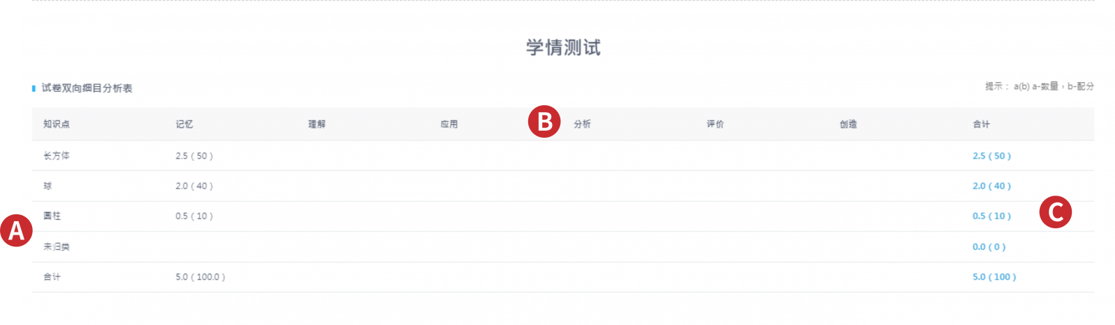 (如圖3-4)分析認(rèn)知層次(A)和知識點(diǎn)(B)交叉關(guān)系,更直觀的呈現(xiàn)試題和配分(C),以及知識點(diǎn)分布和認(rèn)知層次分布。