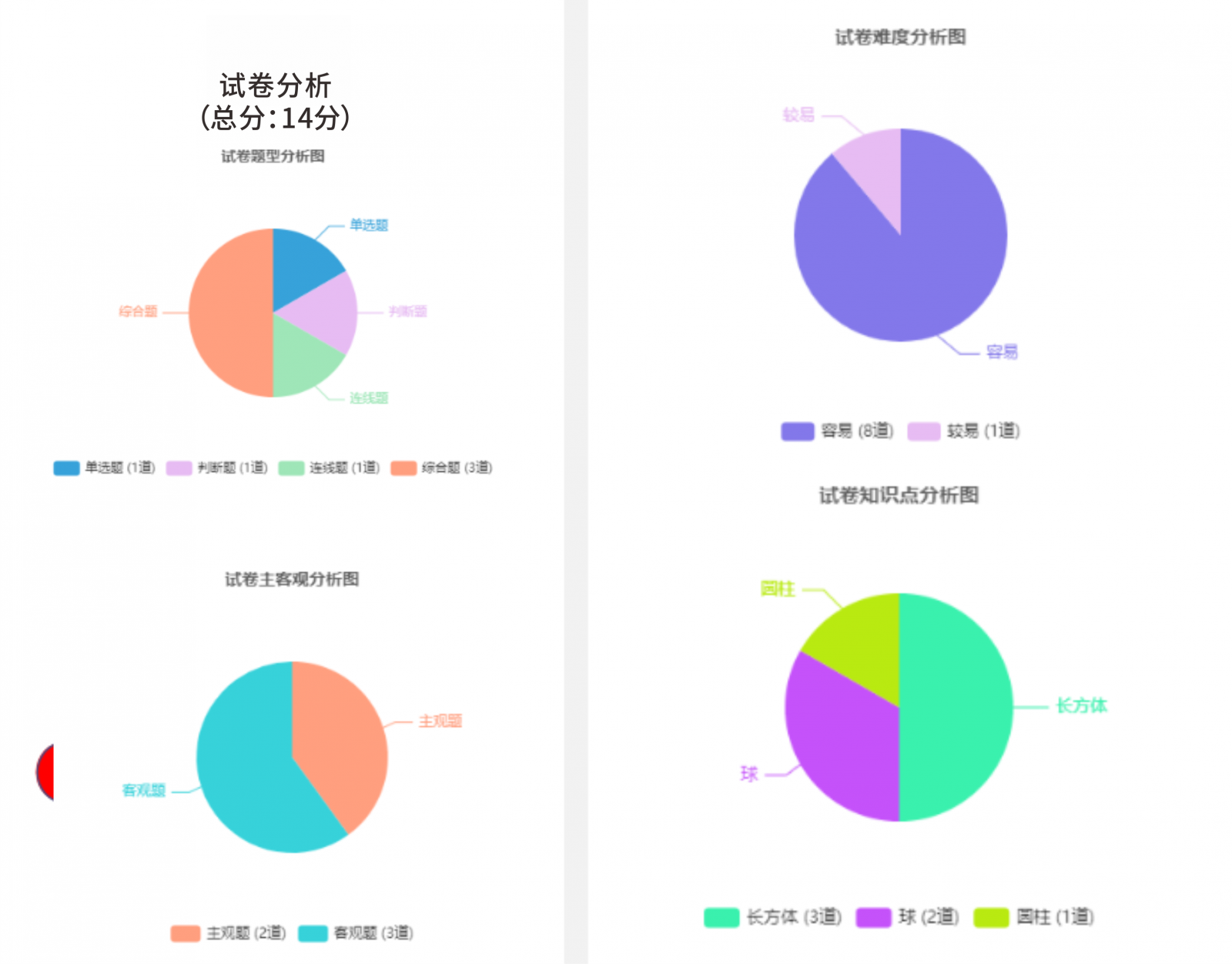 (A)、主客觀(B)、難度(C、知識點(diǎn)(E)等試卷分析圓餅圖。