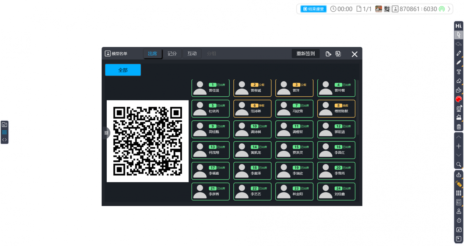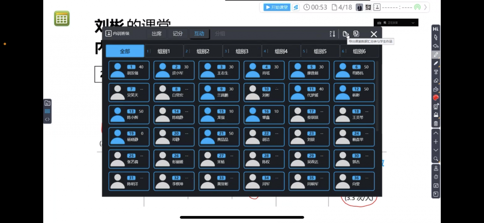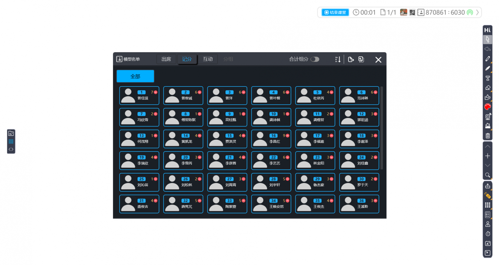 在互動(dòng)頁面會(huì)顯示每一位學(xué)生的互動(dòng)得分?jǐn)?shù)據(jù),如圖