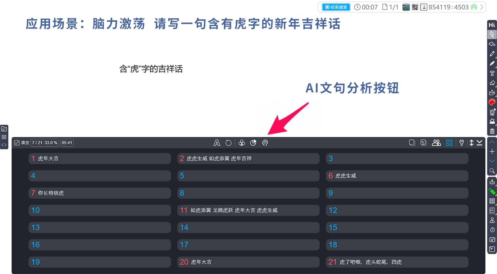 (Brainstorming)應(yīng)用場景,可以快速匯聚文字內(nèi)容的反饋資料,充分激發(fā)全班思考力和創(chuàng)造力。如圖 6之腦力激蕩應(yīng)用場景,虎字吉祥話。