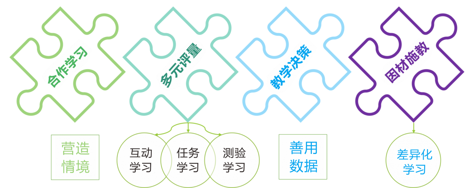TPCK智慧教學(xué)模式可包含合作學(xué)習(xí)、多元評量、教學(xué)決策(數(shù)據(jù)決策)和因材施教等素養(yǎng)導(dǎo)向教學(xué)理念。利用HiTeach系統(tǒng)內(nèi)建之合作學(xué)習(xí)策略,以設(shè)計、營造合作學(xué)習(xí)情境,利用HiTeach之互動學(xué)習(xí)、任務(wù)學(xué)習(xí)和測驗學(xué)習(xí)等教學(xué)工具,設(shè)計素養(yǎng)導(dǎo)向多元評量活動,再借助HiTeach豐富多元的學(xué)習(xí)數(shù)據(jù)儀表,提煉教學(xué)決策模式,最后再利用學(xué)習(xí)統(tǒng)計數(shù)據(jù),實施同步差異化的學(xué)習(xí)活動,如圖6。