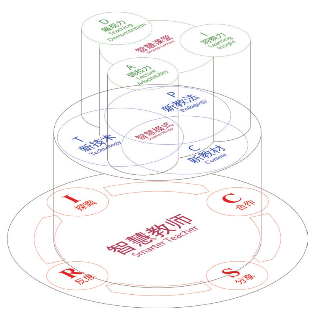 「智慧教育之教師專業(yè)發(fā)展三層式鷹架」(張奕華和吳權(quán)威,2015),是應(yīng)用智慧教室支持系統(tǒng),輔助教師專業(yè)發(fā)展,創(chuàng)造系統(tǒng)性改變的鷹架。從傳統(tǒng)PCK框架 (Shulman, 1986),加入了科技T元素,發(fā)展出了TPCK框架 (Mishra & Koehler, 2006)。教師專業(yè)發(fā)展三層式鷹架理念,加入了整合型的科技系統(tǒng),結(jié)合教師專業(yè)發(fā)展的RICS模型,包括反思、探究、合作、分享模型 (Borthwick & Pierson,2008),以及智慧課堂教師的DIA三種教學(xué)能力,包括教學(xué)展現(xiàn)力(Teaching Demonstration)、學(xué)習(xí)洞察力(Learning Insight)和課堂調(diào)和力(Lecture Adaptability)等,在智慧教室支持系統(tǒng)下,成為理想的教師專業(yè)發(fā)展鷹架,如圖2。