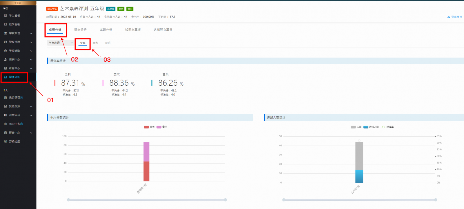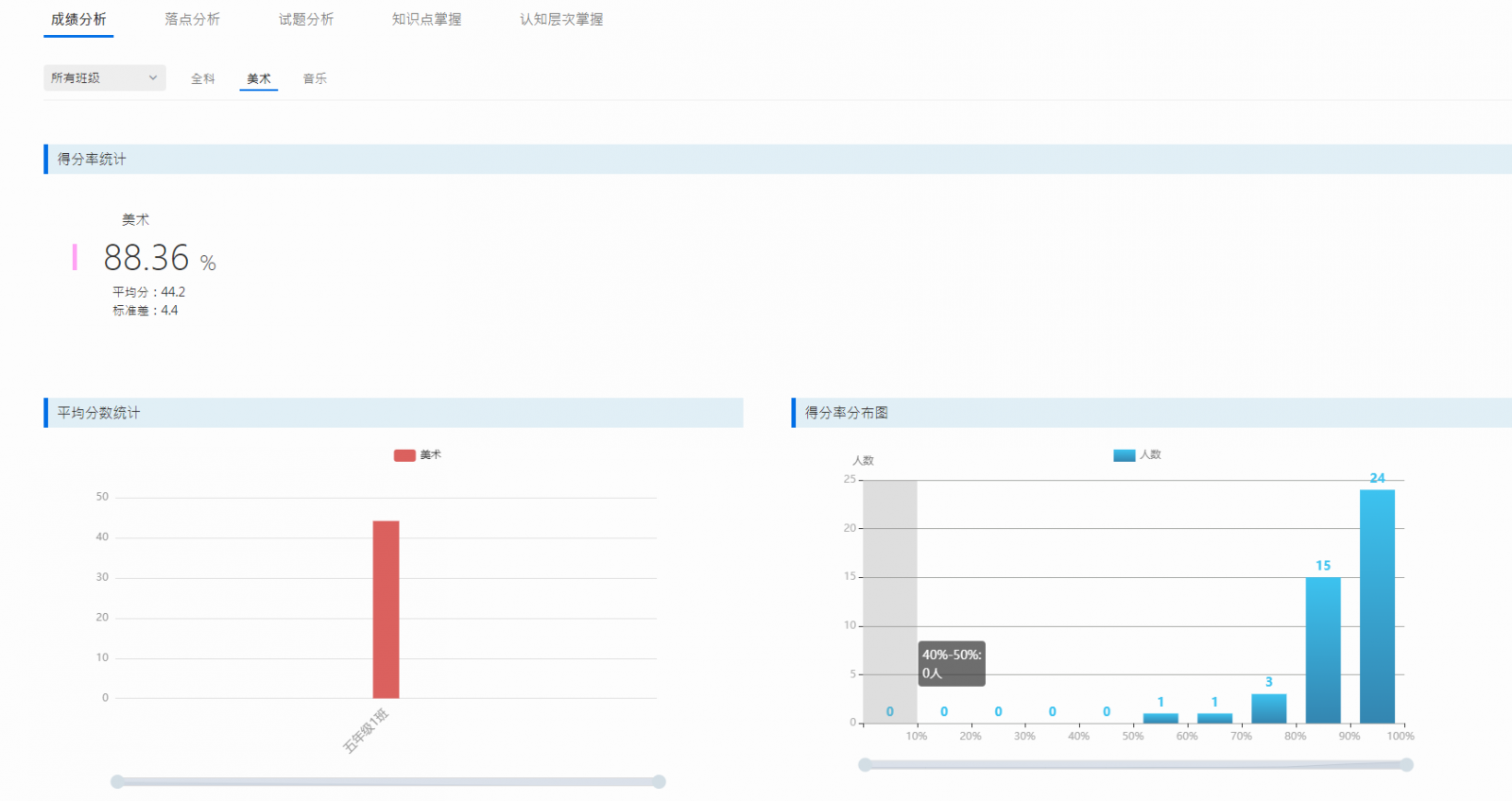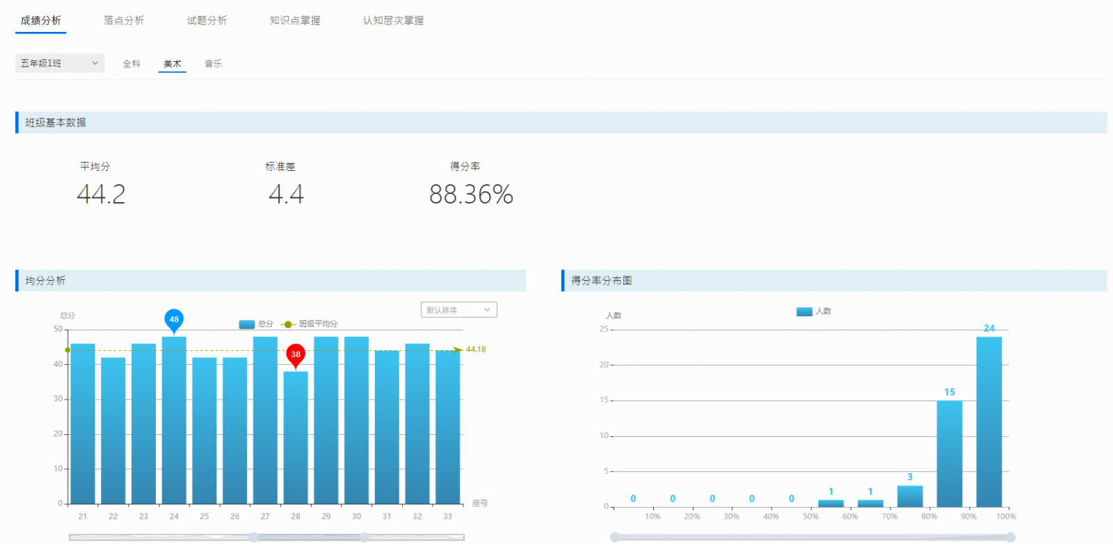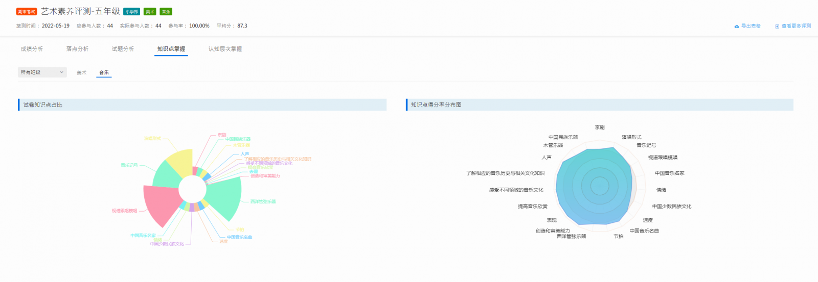 2022年度藝術(shù)素養(yǎng)評(píng)測(cè)為例,評(píng)量活動(dòng)結(jié)束,自動(dòng)產(chǎn)出學(xué)習(xí)評(píng)量數(shù)據(jù)之后,就可以從學(xué)情分析頁面,點(diǎn)選成績分析標(biāo)簽,就會(huì)顯示跨科成績分析,如圖2:跨科成績分析。本次評(píng)量有美術(shù)和英語兩個(gè)學(xué)科,一個(gè)班級(jí)共44位學(xué)生參加評(píng)量,總均分為87.31。并分別列出全科、各科之正答率、平均分、標(biāo)準(zhǔn)差。下方緊接著顯示平均分統(tǒng)計(jì)圖、達(dá)標(biāo)人數(shù)統(tǒng)計(jì)圖,以及圖3:跨科成績分析(全科)得分率分布圖、圖4:跨科成績分析(全科)各班平均與達(dá)標(biāo)率統(tǒng)計(jì)表、圖5:跨科成績分析(全科)達(dá)標(biāo)情況統(tǒng)計(jì)表。