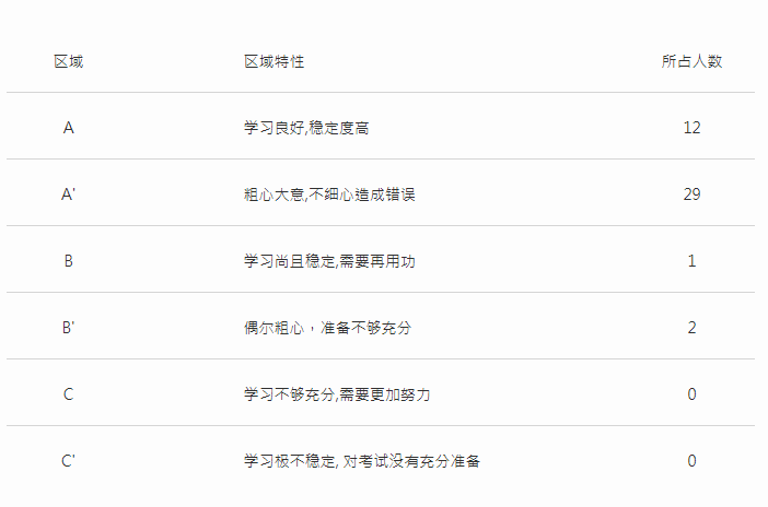 A、A'、B、B'、C、C'等六區(qū),落在A區(qū)的學(xué)生,代表學(xué)習(xí)良好穩(wěn)定度高,落在A'區(qū)的學(xué)生,代表粗心大意不細(xì)心造成錯(cuò)誤,落在B區(qū)的學(xué)生,代表學(xué)習(xí)尚且穩(wěn)定需要再用功,落在B'區(qū)的學(xué)生,代表偶爾粗心準(zhǔn)備不夠充分,落在C區(qū)的學(xué)生,代表學(xué)習(xí)力不夠充分需要更加努力,落在C'區(qū)的學(xué)生,代表學(xué)習(xí)不穩(wěn)定對(duì)考試沒有充分準(zhǔn)備,如圖11。