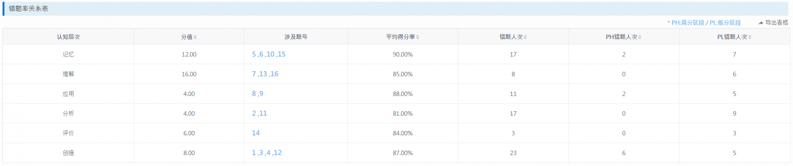 21:認(rèn)知層次得分率統(tǒng)計(jì)圖與認(rèn)知層次得分詳情表