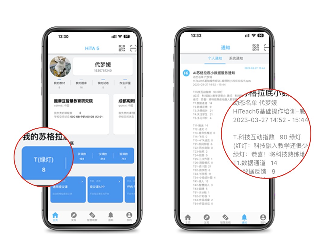 練習(xí)AI蘇格拉底范例檔各個(gè)招式和操作流程時(shí),搭配AI蘇格拉底小數(shù)據(jù)服務(wù),這樣,每次練習(xí)超過10分鐘產(chǎn)出的HiTeach互動(dòng)課堂數(shù)據(jù),會(huì)實(shí)時(shí)在手機(jī)HiTA中收到AI蘇格拉底小數(shù)據(jù)服務(wù)通知,通知內(nèi)容包括科技互動(dòng)指數(shù)和燈號(hào),以及使用各種互動(dòng)工具的頻次。當(dāng)科技互動(dòng)指數(shù)超過70分時(shí),就會(huì)顯示為T(綠燈),同時(shí)在HiTA主頁的我的蘇格拉底欄位,自動(dòng)累計(jì)T(綠燈)的次數(shù)。AI蘇格拉底小數(shù)據(jù)服務(wù),隨時(shí)隨地反饋科技互動(dòng)教學(xué)之行為數(shù)據(jù)分析,就象是貼心的AI小教練,幫助教學(xué)者更精準(zhǔn)地操作技巧與應(yīng)用要領(lǐng)。