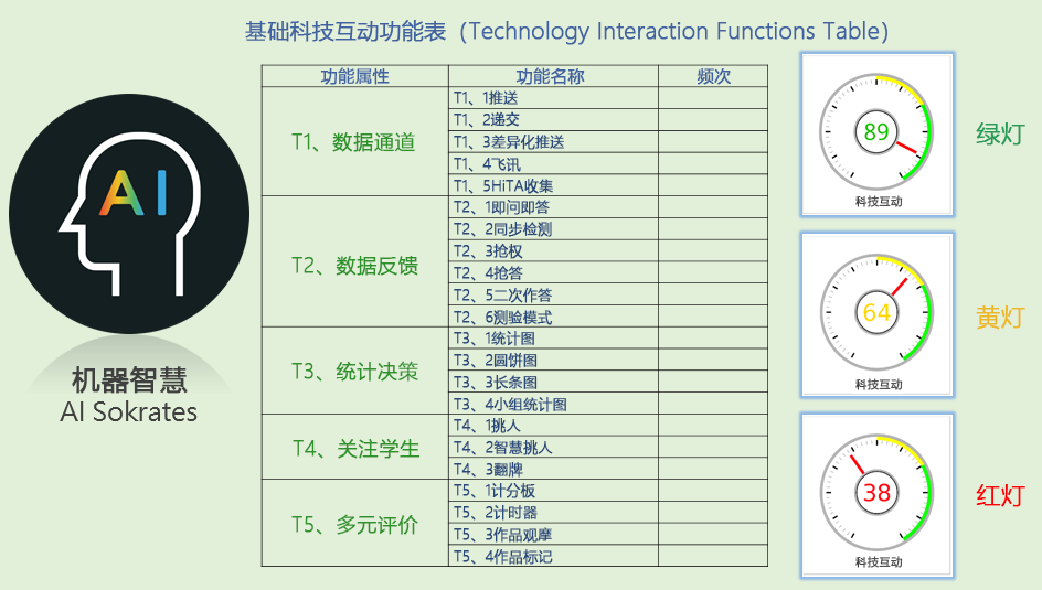 科技互動(dòng)(T)指數(shù),是AI蘇格拉底自動(dòng)采收科技互動(dòng)教學(xué)行為數(shù)據(jù)特征,根據(jù)使用HiTeach互動(dòng)功能組合,分析有效互動(dòng)的指數(shù)(0-99),70分以上為綠燈,50-70分黃燈,50分以下為紅燈,適當(dāng)科技互動(dòng)功能組合,可獲得較高指數(shù)?;A(chǔ)科技互動(dòng)功能包括即問即答(Pop Quiz)、統(tǒng)計(jì)圖(Show Chart)、挑人(Pick-Out)、計(jì)分板(Scoreboard)、推送(Push)等二十多項(xiàng)教學(xué)模塊和互動(dòng)功能,如圖4。