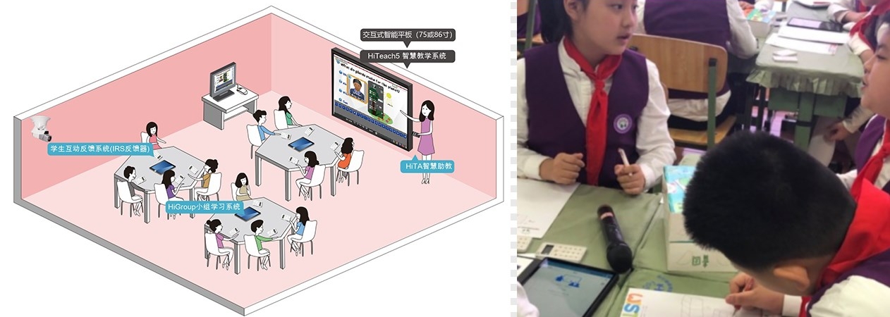 電子書包(平板)智慧教室是實(shí)踐群學(xué)一對一的基礎(chǔ)環(huán)境,硬件環(huán)境(圖7),是每一個(gè)學(xué)生都使用平板或電腦的智慧教學(xué)環(huán)境。平板智慧教室是更理想的類一對一學(xué)習(xí)環(huán)境,能在群學(xué)環(huán)境中隨時(shí)轉(zhuǎn)換為一對一因材施教模式。教師端在大屏上操作 HiTeach 5軟件,可以隨時(shí)推送教材到學(xué)生端,也可以隨時(shí)接收學(xué)生端的學(xué)習(xí)數(shù)據(jù),或根據(jù)每一位學(xué)生的學(xué)習(xí)數(shù)據(jù),同步推送差異化的教材給指定個(gè)人,布置差異化學(xué)習(xí)任務(wù)。西川實(shí)驗(yàn)學(xué)校(南區(qū)),采用學(xué)生自帶平板(BYOD)之班級平板智慧教室,實(shí)施因材施教群學(xué)的類一對一智慧課堂(圖8)。