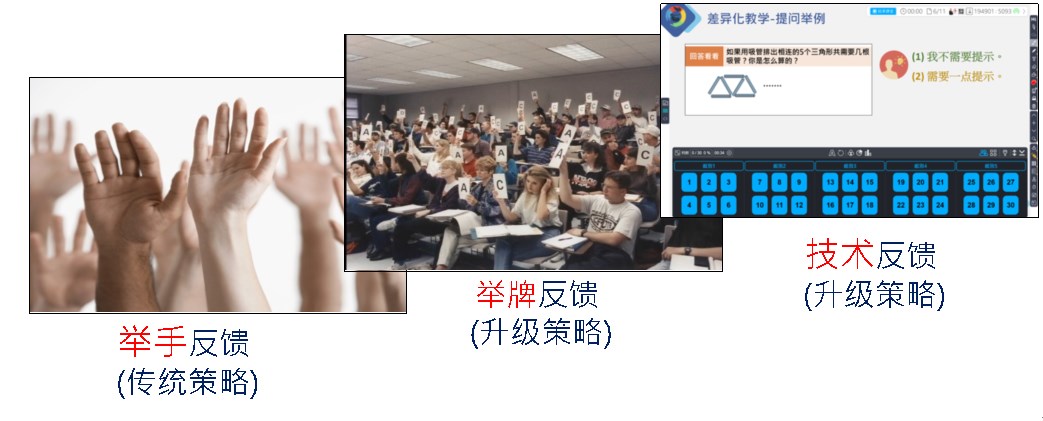 教師提問邀請學(xué)生舉手,教師再從舉手學(xué)生中挑人反饋,是傳統(tǒng)課堂經(jīng)常采用的舉手反饋策略。三十多年前,哈佛大學(xué)教授采用舉牌反饋策略,請助教協(xié)助統(tǒng)計(jì)選項(xiàng)人數(shù),作為教學(xué)決策依據(jù),實(shí)施相應(yīng)之教學(xué)策略,例如:同儕討論、二次作答等策略。導(dǎo)入智慧型教室,學(xué)生人人有終端之后,采用適當(dāng)技術(shù)反饋策略,就能充分體現(xiàn)技術(shù)賦能變革課堂的全新課堂樣態(tài)(圖10)。