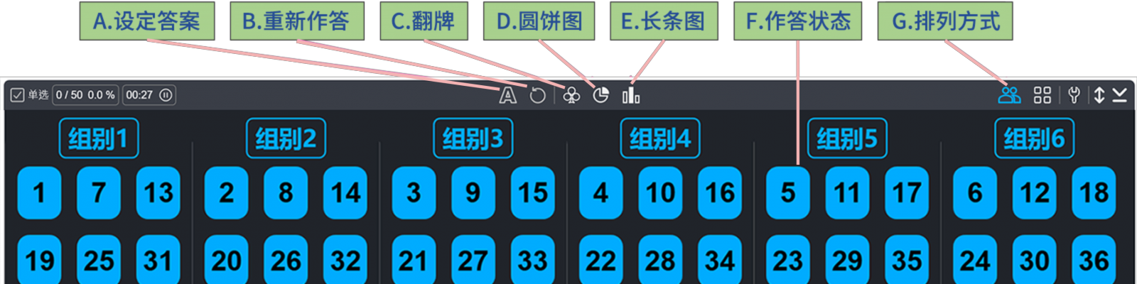 圖11:紫藤小學(xué)提問設(shè)計(jì)的第3選項(xiàng) 二、技術(shù)賦能的數(shù)據(jù)分析 教師端接收到全班學(xué)生的技術(shù)反饋數(shù)據(jù)后,可以打開數(shù)據(jù)互動區(qū)選項(xiàng)分析儀表(圖12),查看全班或小組的選項(xiàng)圓餅圖、長條圖,也可翻牌查看個(gè)人選項(xiàng)數(shù)據(jù)等。