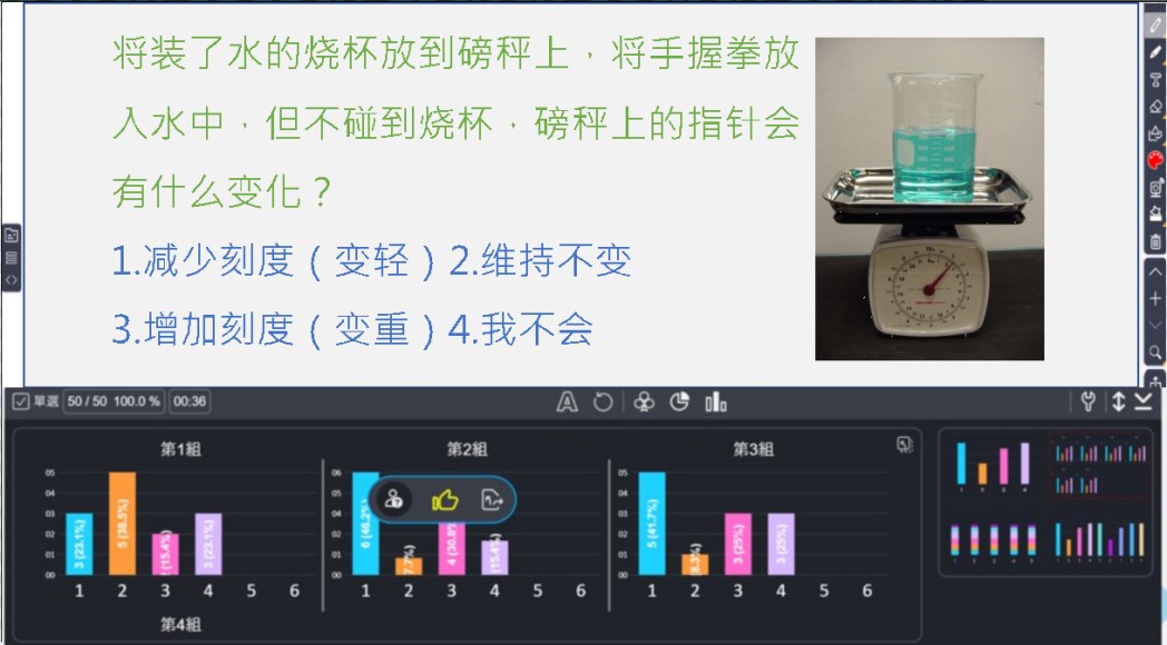 圖26:學(xué)生上臺解讀數(shù)據(jù) 二、看見思考,創(chuàng)造改變 技術(shù)賦能的課堂,教師提問學(xué)生反饋后,教師通過即時(shí)生成的反饋數(shù)據(jù),看見全班、小組,甚至每一位學(xué)生的思考。教師通過教學(xué)決策來創(chuàng)造改變,喚醒迷思的、不懂的學(xué)生,創(chuàng)造思考轉(zhuǎn)變與理解。