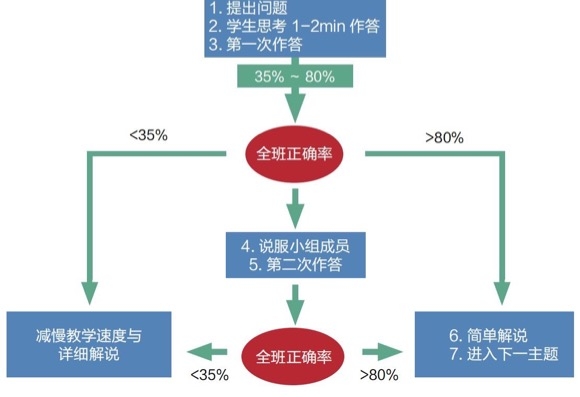 不同的技術(shù)融合課堂情境 (IRS智慧教室、TBL智慧教室、平板智慧教室等),需要分別設(shè)計(jì)適當(dāng)?shù)慕虒W(xué)決策樹,才能發(fā)揮技術(shù)賦能的教學(xué)決策效益。例如美國哈佛大學(xué)物理系教授Eric Mazur研究團(tuán)隊(duì)的PI同儕教學(xué)模式(Peer Instruction,簡稱為PI),就是應(yīng)用數(shù)據(jù)進(jìn)行教學(xué)決策最經(jīng)典的案例,圖14是PI同儕教學(xué)決策樹的設(shè)計(jì),當(dāng)學(xué)生通過率超過一定比率(例如80%)后,就進(jìn)入下一個(gè)概念;通過率小于一定比率(例如50%)時(shí),表示問題太難,教師必須進(jìn)一步解釋;當(dāng)通過率介于兩者之間時(shí),就是最佳的同儕教學(xué)時(shí)機(jī)。