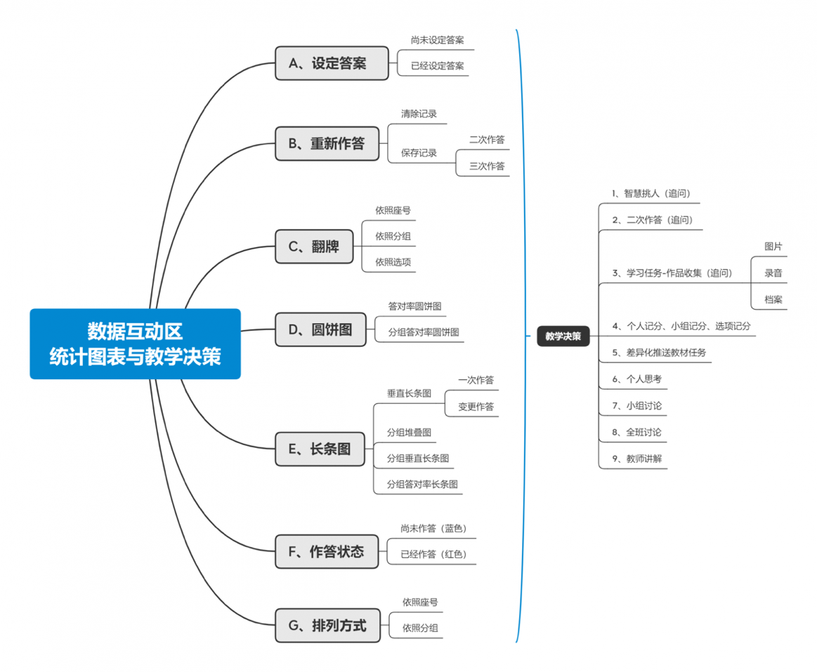 圖14:技術(shù)賦能的教學(xué)決策樹 利用數(shù)據(jù)互動區(qū)的數(shù)據(jù)分析,所呈現(xiàn)的不同類型統(tǒng)計(jì)圖表,作為課堂教學(xué)決策依據(jù),再進(jìn)一步實(shí)施應(yīng)用技術(shù)或教師介入的教學(xué)組合應(yīng)用,例如:智慧挑人、二次作答、布置學(xué)習(xí)任務(wù)、記分、推送教材、進(jìn)行個(gè)人思考、小組討論、全班討論、教師講解等(圖15)。