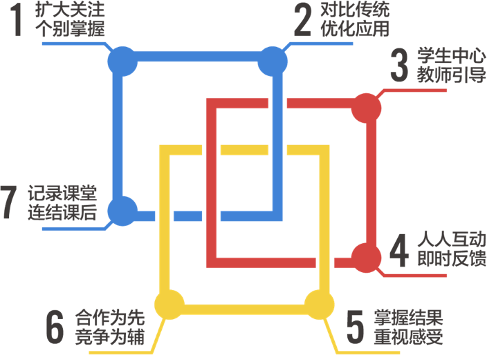 在技術(shù)融合課堂情境中,變革課堂要兼顧傳承與創(chuàng)新,以實(shí)現(xiàn)技術(shù)賦能的積極效益。下面是七個(gè)技術(shù)賦能的應(yīng)用技巧與心法(如圖16):一、擴(kuò)大關(guān)注,個(gè)別掌握,二、對比傳統(tǒng),優(yōu)化應(yīng)用,三、學(xué)生中心,教師引導(dǎo),四、人人互動,即時(shí)反饋、五、掌握結(jié)果,重視感受,六、合作為先,競爭為輔,七、記錄課堂,連結(jié)課后。