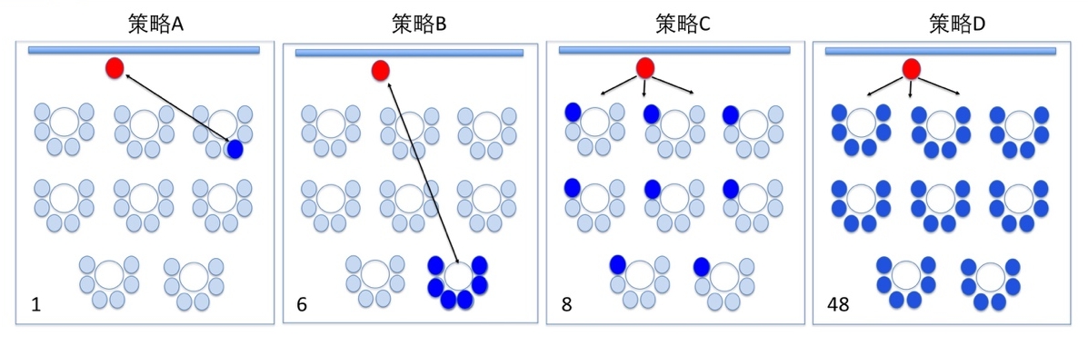在技術(shù)融合課堂情境中,教師要能運(yùn)用數(shù)據(jù)通道,擴(kuò)大對學(xué)生的關(guān)注范圍,也要能運(yùn)用數(shù)據(jù)掌握個(gè)別學(xué)生學(xué)習(xí)情況。例如,在引起動機(jī)階段,你會采行哪一種提問互動策略呢?在智慧教室的課堂里,許多教師會采用提問互動策略,請幾位同學(xué)來說一說,把這堂課準(zhǔn)備要發(fā)展的內(nèi)容引出來。而在智慧教室里,除了應(yīng)用原來的提問策略,更要發(fā)揮智慧教室人手都有智慧終端的環(huán)境,運(yùn)用數(shù)據(jù)通道,擴(kuò)大互動與關(guān)注的規(guī)模。而且同步采收數(shù)據(jù),掌握每一個(gè)孩子的情況(圖17),提問策略A、策略B、策略C、策略D,關(guān)注學(xué)生的范圍數(shù)量大不同,在課堂中可交互采用提問策略,加大對學(xué)生的關(guān)注,也注重對個(gè)別學(xué)生的掌握。