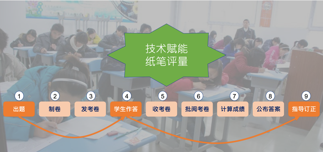 例如,紙本試卷從1.出題、2.制卷、3.發(fā)考卷、4.學(xué)生作答、5.收考卷、6.批閱考卷(或交換批改)、7.計(jì)算成績、8.公布答案、9.指導(dǎo)訂正(如圖18場景)等學(xué)習(xí)評量實(shí)施步驟,既費(fèi)時(shí)又沒效率,且不能詳細(xì)的評量數(shù)據(jù)。而應(yīng)用智慧教室系統(tǒng)的學(xué)習(xí)評量,可以將圖18中2,3,5,6,7,8等實(shí)施步驟,交給數(shù)字化工具來處理。這樣,不但可以提高學(xué)習(xí)評量效能,又能保存完整學(xué)習(xí)評量數(shù)據(jù),進(jìn)一步應(yīng)用評量結(jié)果數(shù)據(jù),更精準(zhǔn)的指導(dǎo)訂正。