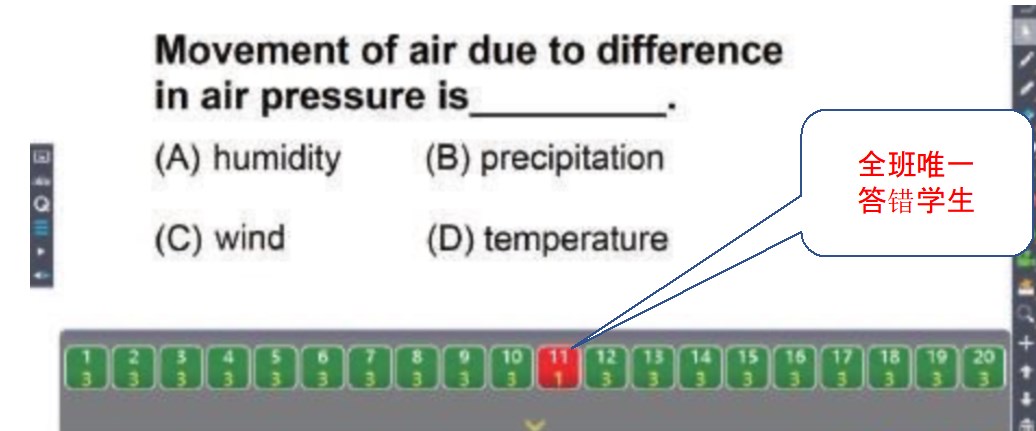 設(shè)有正確答案的問題,當(dāng)展示統(tǒng)計(jì)圖后,發(fā)現(xiàn)大多數(shù)學(xué)生都答對了,只有少數(shù)選錯(cuò)時(shí),要謹(jǐn)慎使用翻牌功能,如圖,翻牌,把唯一一位答錯(cuò)的學(xué)生展示出來,使該生有強(qiáng)大壓力,造成負(fù)面感受。