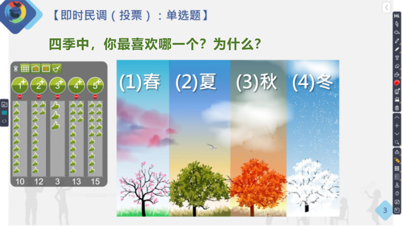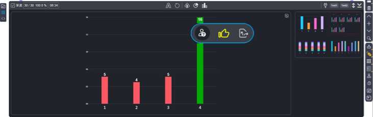 統(tǒng)計(jì)點(diǎn)、提示點(diǎn)、討論點(diǎn)和翻牌點(diǎn),就是運(yùn)用數(shù)據(jù)的時(shí)機(jī)和技巧,例如,在教師展示統(tǒng)計(jì)圖表后,是否適時(shí)給學(xué)生一些提示,再進(jìn)行二次作答,或者給學(xué)生時(shí)間進(jìn)行小組討論。對于沒有標(biāo)準(zhǔn)答案的選擇題,可以使用翻牌功能,把每一個(gè)人的選擇意見展示出來,再進(jìn)一步討論和追問。