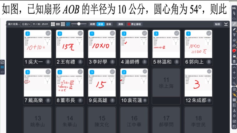 技術(shù)賦能的課堂,可快速匯整個(gè)人或小組合作的成果或作品,在共同平臺中呈現(xiàn)出來,或推送到各小組,讓大家更方便看見其他小組的看法。 匯聚不同看法與思考,碰撞出多元討論與思考(圖30),教師揭示扇形面積計(jì)算問題后,學(xué)生使用平板把計(jì)算過程和答案回傳,再由教師邀請不同解題類型的同學(xué)來分享算法。