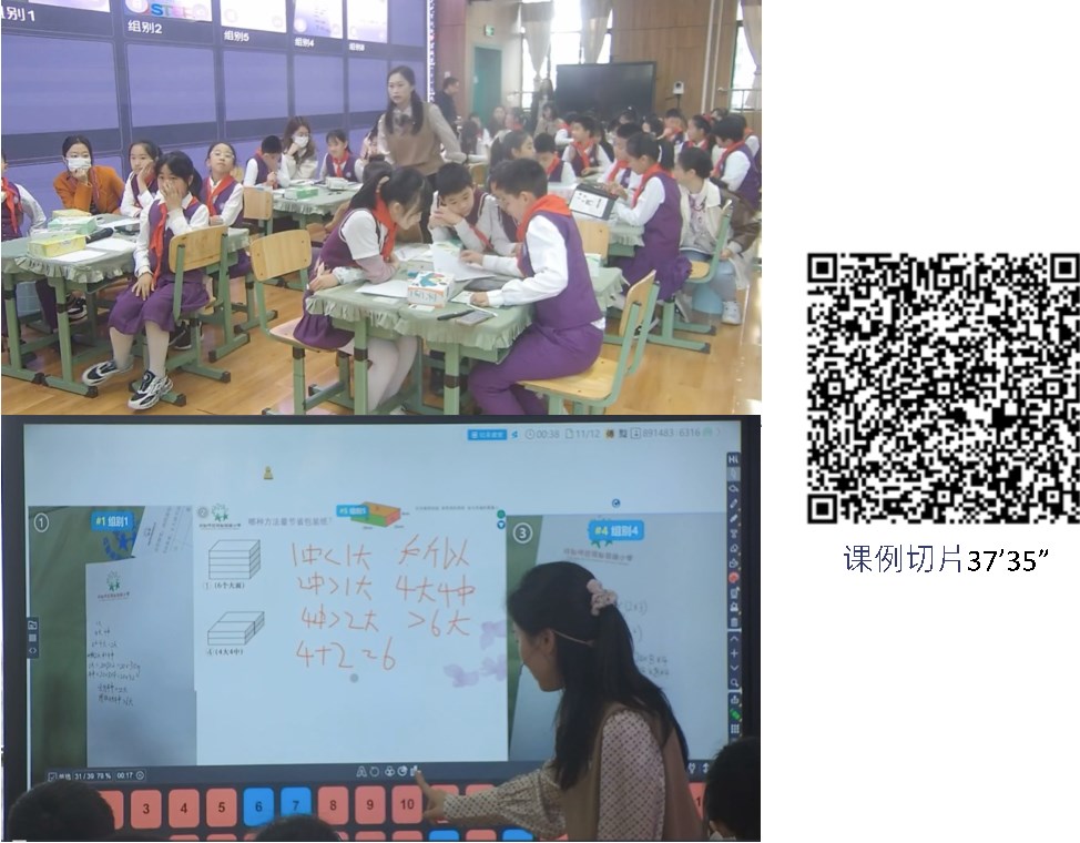 「第五屆課堂變革與教學(xué)領(lǐng)導(dǎo)力提升」專題研討會(2023.3.23-24)小學(xué)數(shù)學(xué)場展示課例:成都市成都師范銀都紫藤小學(xué)傅越老師的五年級數(shù)學(xué)《包裝的學(xué)問:長方體的認(rèn)識》,課例切片37’35”,小組利用平板回傳作品,接著挑選三組作品,再全班投票選出作品,然后由該小組派代表上臺分享(圖31)。