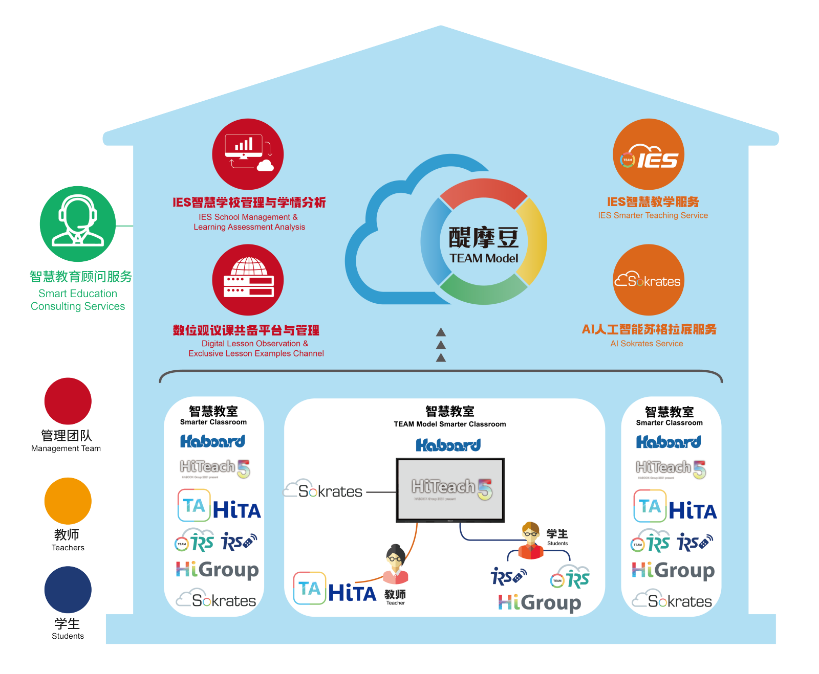 醍摩豆(TEAM Model)智慧教室是基于HiTeach智慧教學(xué)系統(tǒng)而成的智慧教室,也是AI智慧學(xué)校的基礎(chǔ)組成單位。醍摩豆(TEAM Model)智慧教室從課堂中的“教”與“學(xué)”出發(fā),完美整合課堂中所需的各項(xiàng)軟件、硬件以及云端、AI人工智慧、大數(shù)據(jù)等各項(xiàng)服務(wù),無須繁復(fù)的操作,就能幫助老師和學(xué)生,達(dá)成現(xiàn)代化課堂的理想境界,翻轉(zhuǎn)傳統(tǒng)教學(xué)現(xiàn)場(chǎng)。